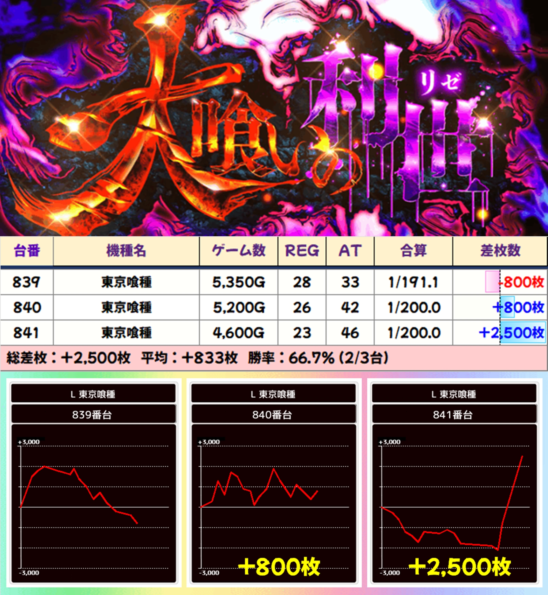 【3台並び】東京喰種(839-841番台)→平均+833枚