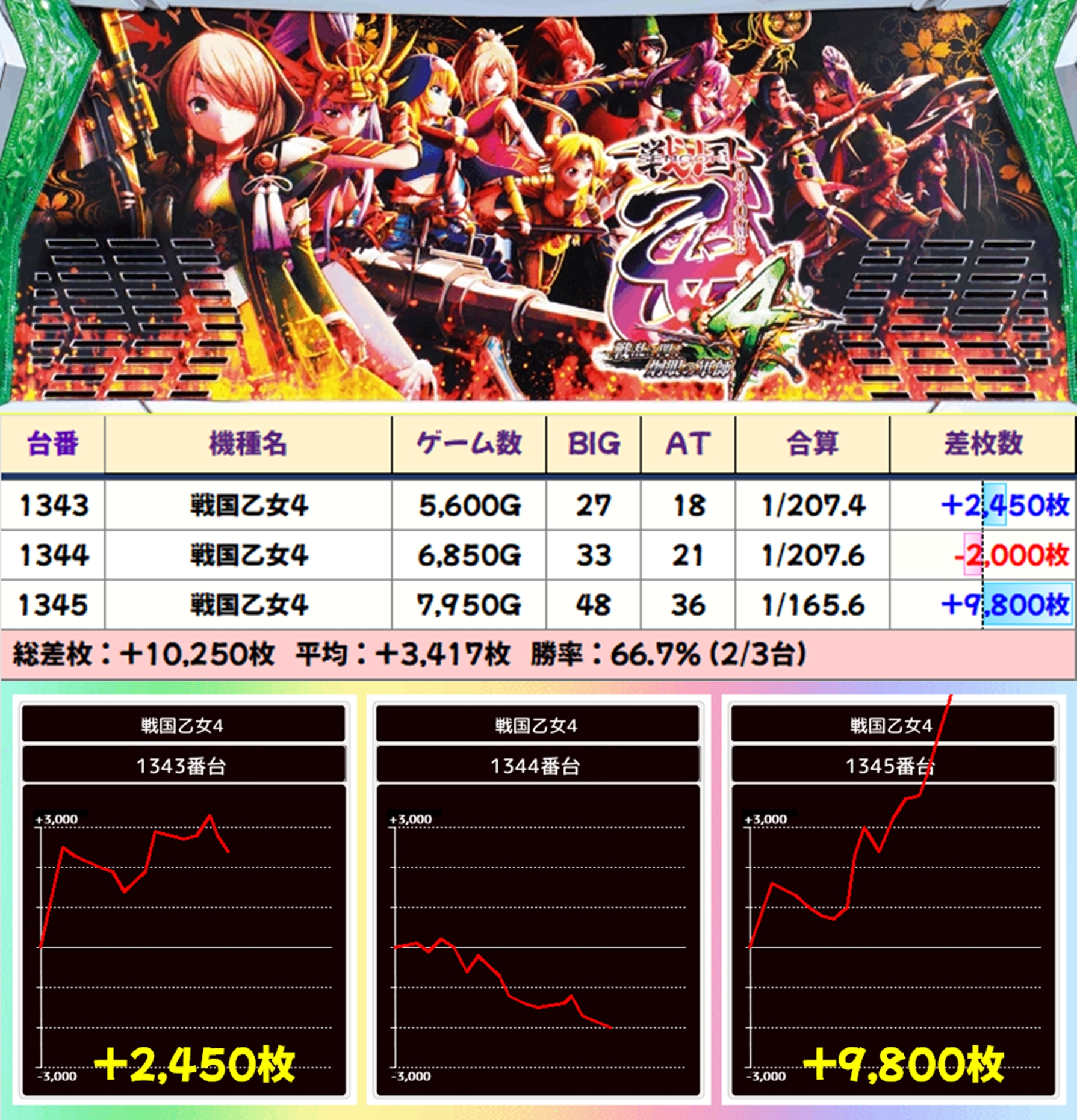 【3台並び】戦国乙女4(1343-1345番台)→平均+3,417枚