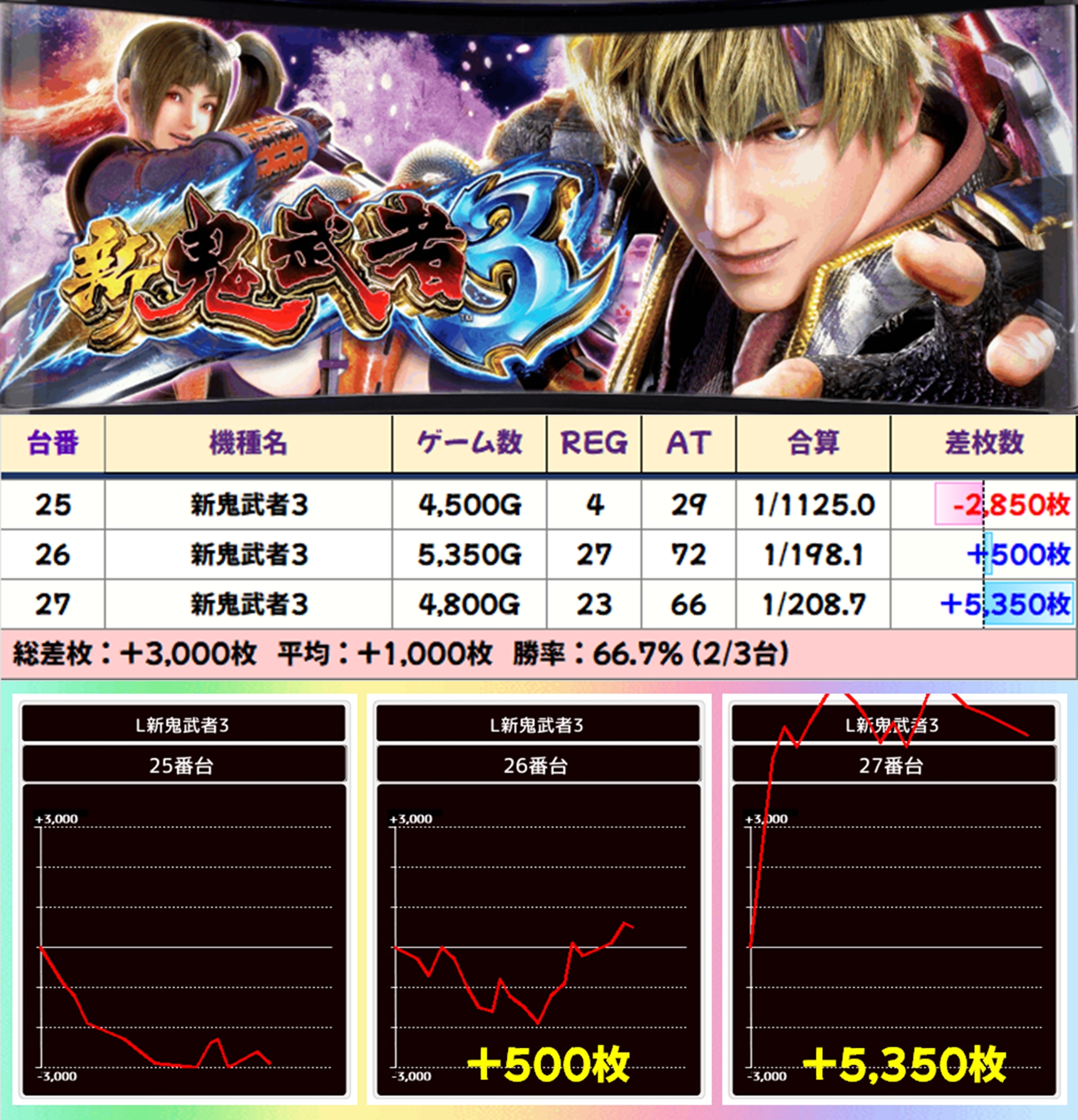 【3台並び】新鬼武者3(25-27番台)→平均+1,000枚