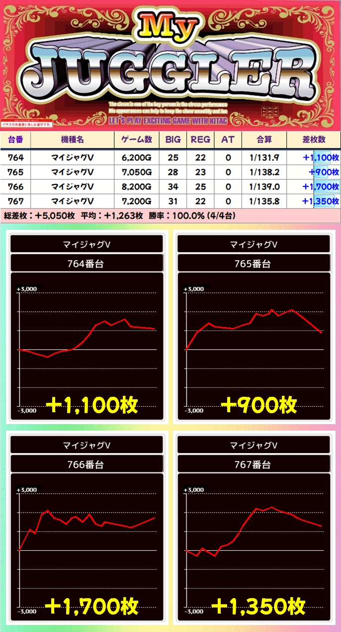 【4台並び】マイジャグV(764-767番台)→平均+1,263枚