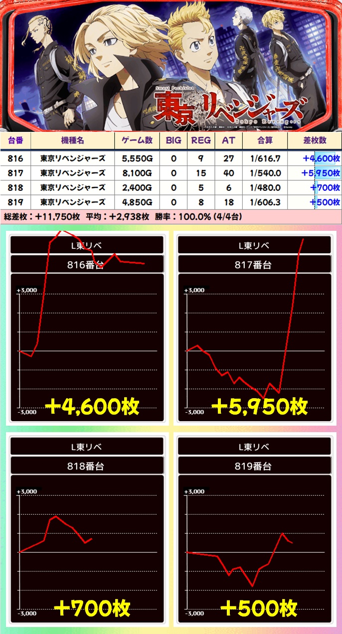 【4台並び】東リべ(816-819番台)→平均+2,938枚