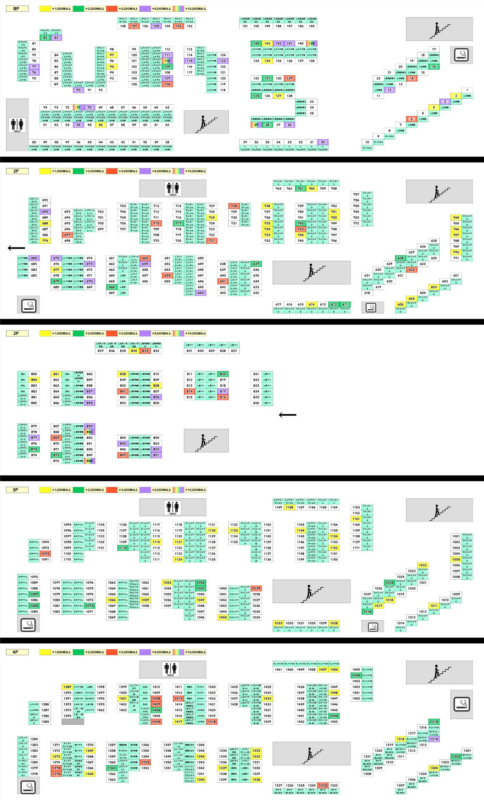 前日のサンキューの日にはかないませんでしたが、今回も3台以上の並びが大量!4の日ということで半数弱が4台並びに。多くの並びが平均1000枚超でヴヴヴや東京喰種は平均7000枚超と超大量獲得しました!