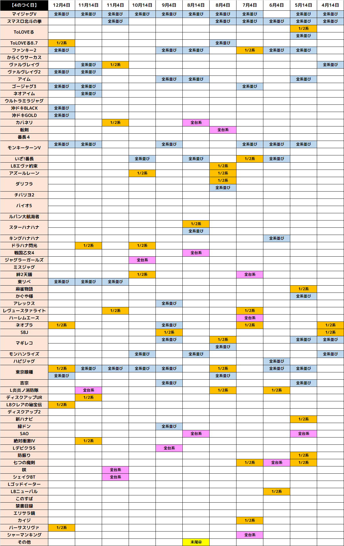 今回は4の日の結果をレポート!4のつく日は4台機種や4台並びなど④にまつわる仕掛けがメインとなる日です。