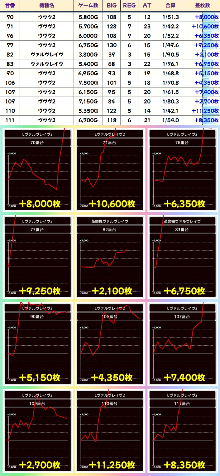 初代、2ともに大量出玉を確認。ヴァルヴレイヴ2は万枚オーバーだけでなく、5000枚超もあり台平均もプラス差枚!