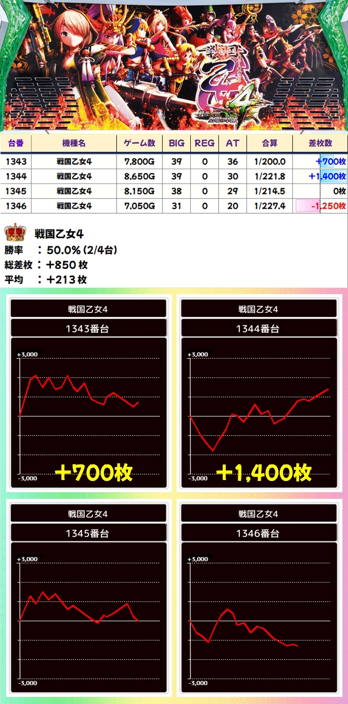 今回は4台設置かつシリーズ4作目の戦国乙女が全系らしき結果に!仕掛けとしては不発気味にはなってしまいましたが、稼働を見る限りでは優秀台であったことは間違いないでしょう。
