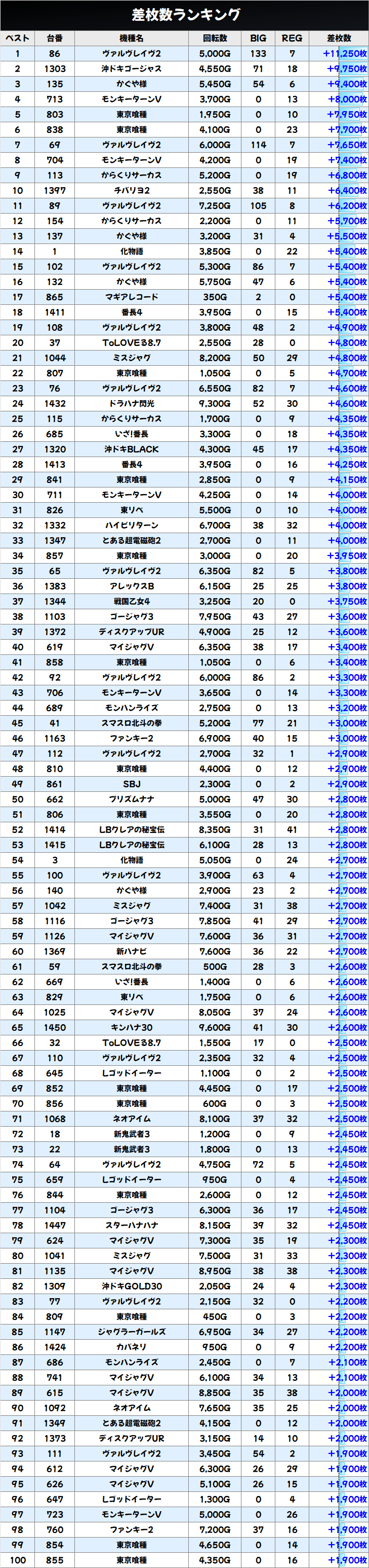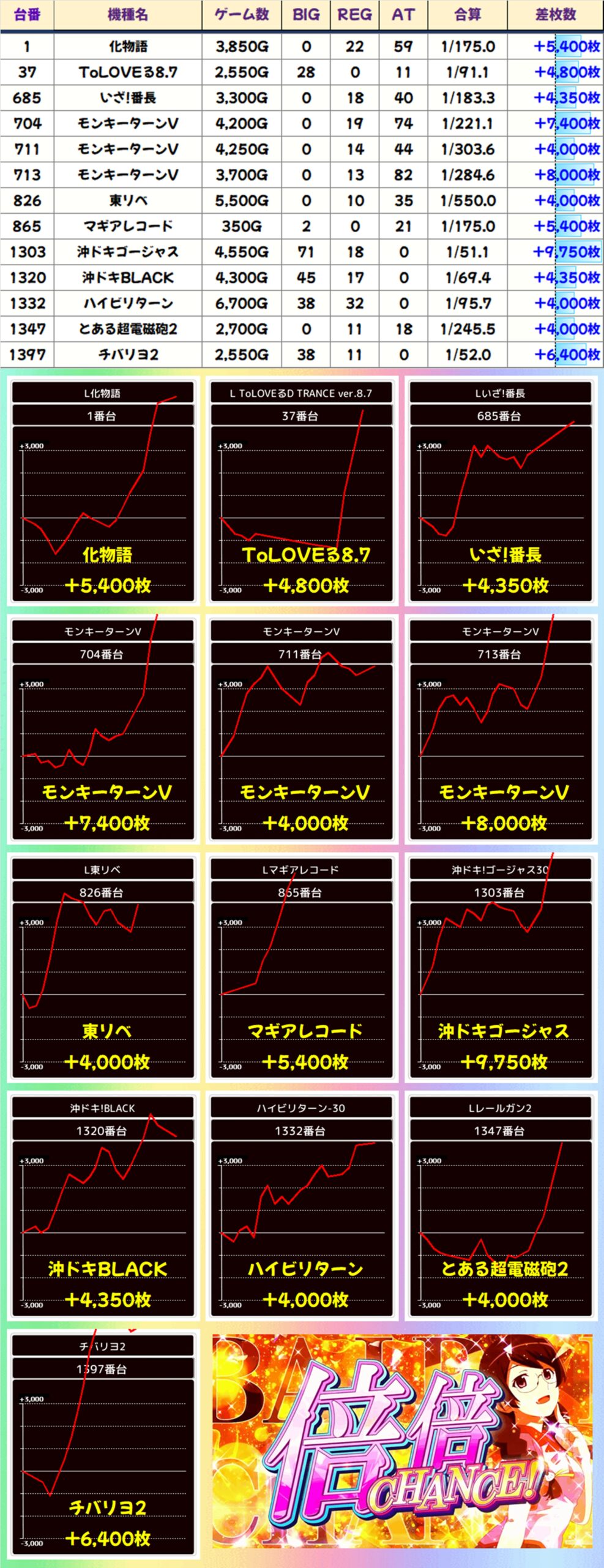 紹介してきた仕掛け以外にも単品の優秀台が多数あり、5の日機種の一つであるモンキーターンVからも優秀な出玉が出現。その他、化物語やToLOVEる8.7、東リベなど多くの機種からお宝台を確認できました!