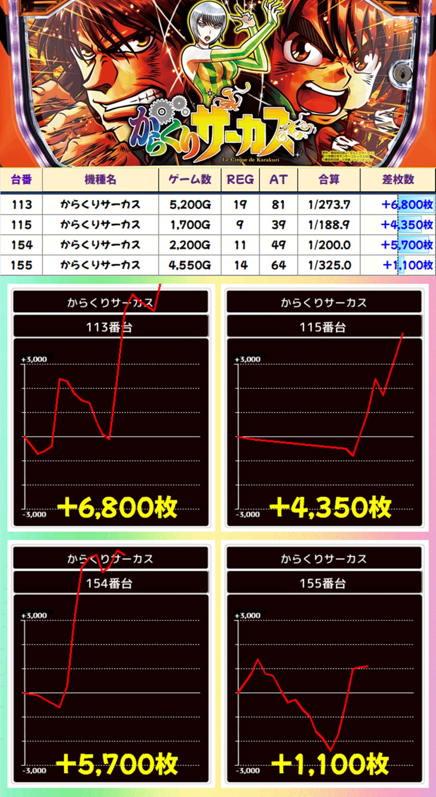 からくりサーカスは少々不発気味でしたが、+6800枚や+5700枚の出玉を確認!