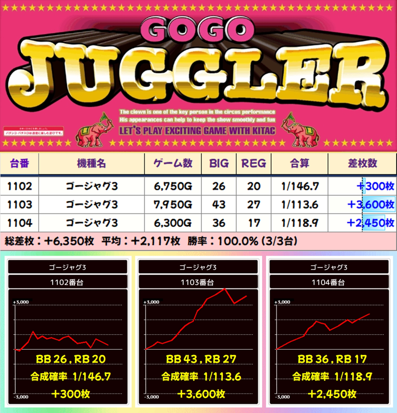 【3台並び】ゴージャグ3(1102-1104番台)→平均+2,117枚