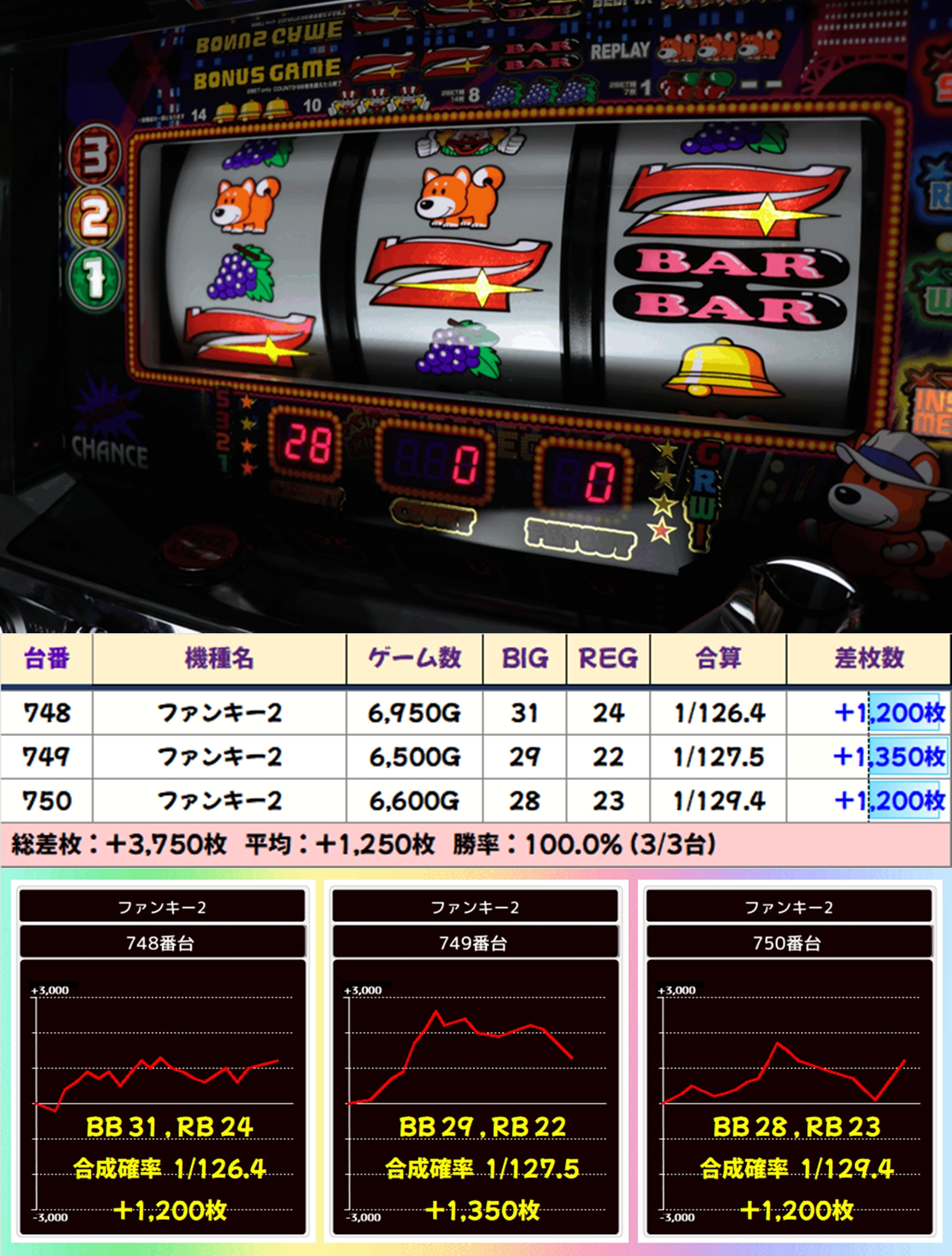 【3台並び】ファンキー2(748-750番台)→平均+1,250枚