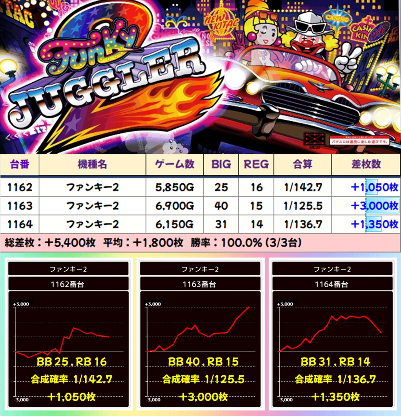 【3台並び】ファンキー2(1162-1164番台)→平均+1,800枚