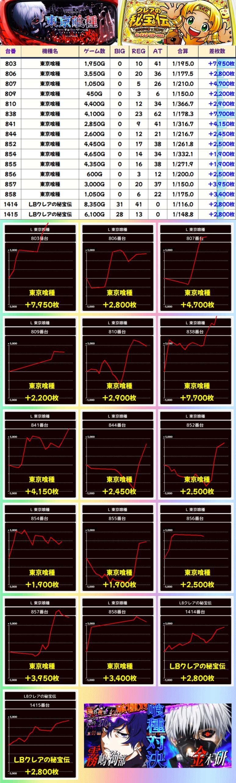 東京喰種とジャグラー以外のAタイプであるLBクレアの秘宝伝が1/2系濃厚の仕掛けとなり、いずれの機種からも優秀な出玉が多数出現。