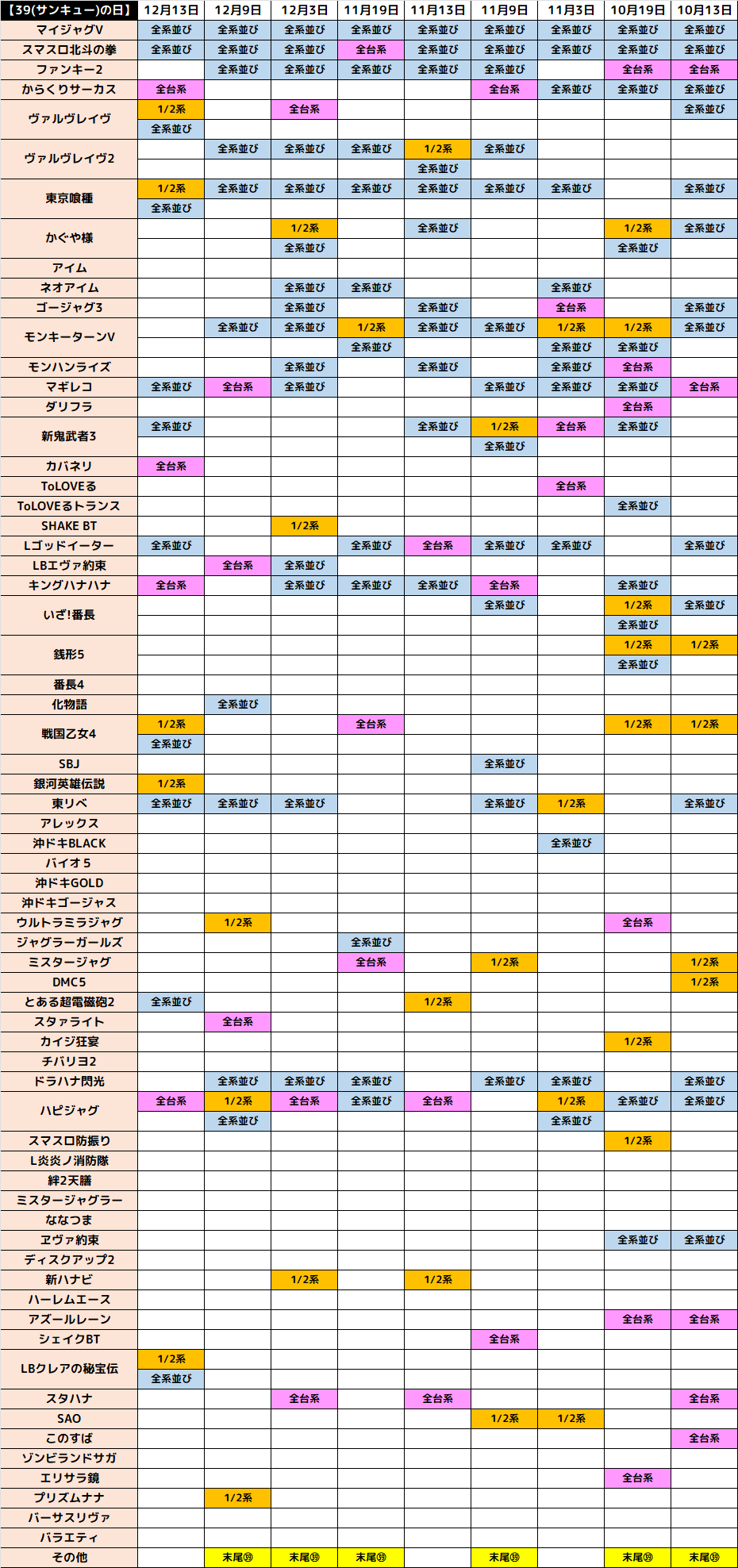 また、全台系③機種と大量の③台並びが③⑨の日に恒例の仕掛けとなっており、いずれの仕掛けも幅広い機種から出現を確認できております。