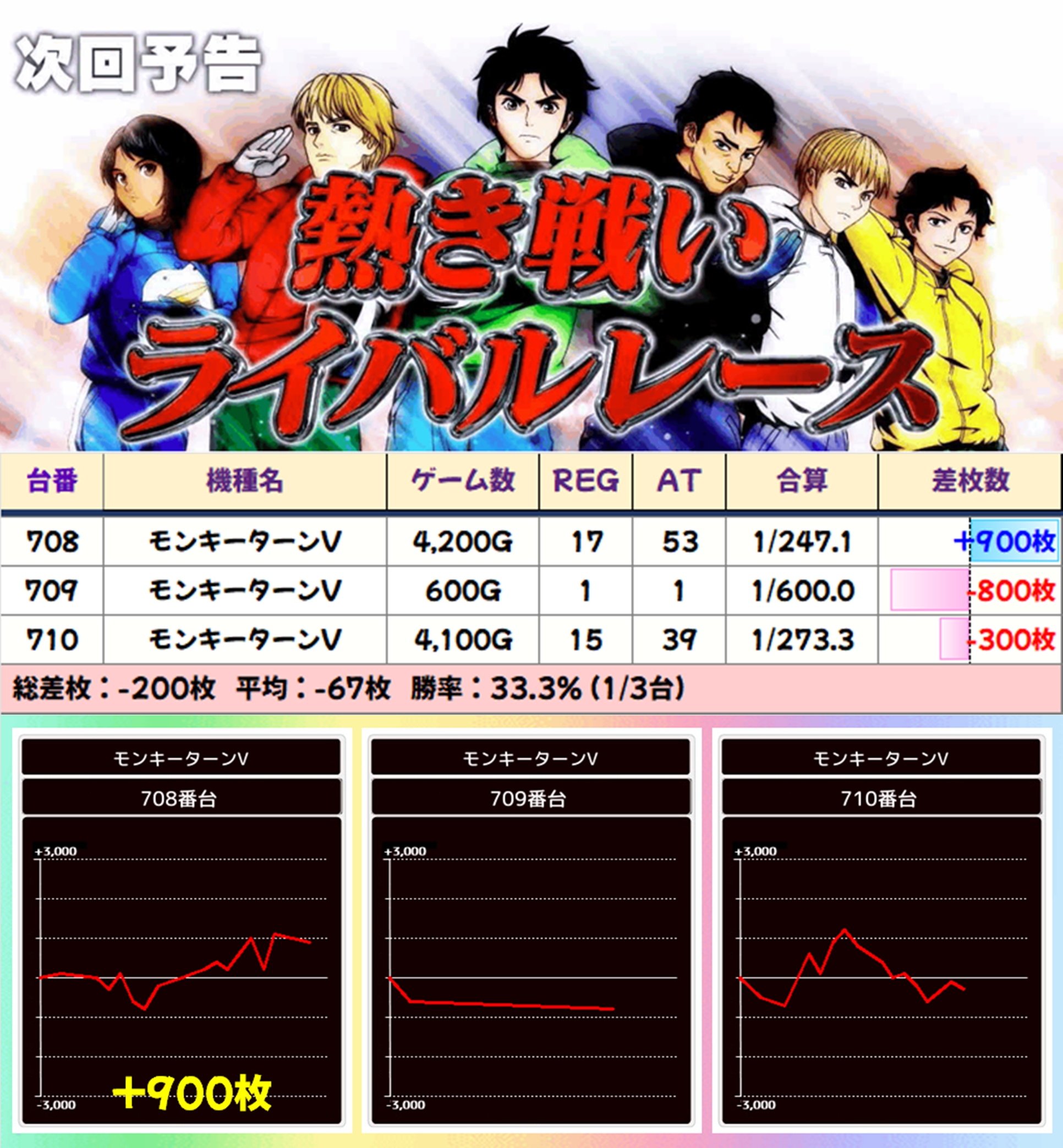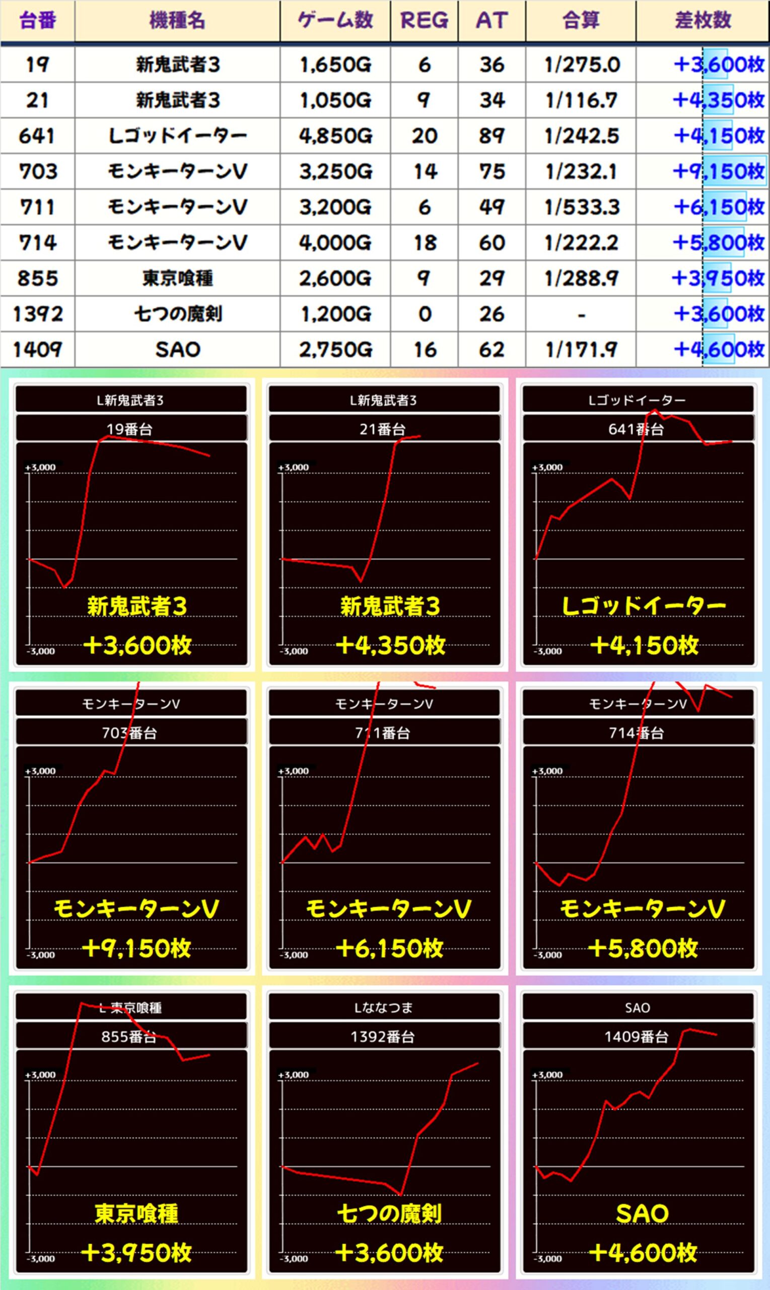 東京喰種には2か所の並びがあり、+10600枚の万枚オーバーも出現。また、モンキーターンVには3か所の並びがありましたが、1か所は不発や打ち込み不足によりトータルマイナスに…。ただし、その他の2か所からは優秀な出玉を確認できました。