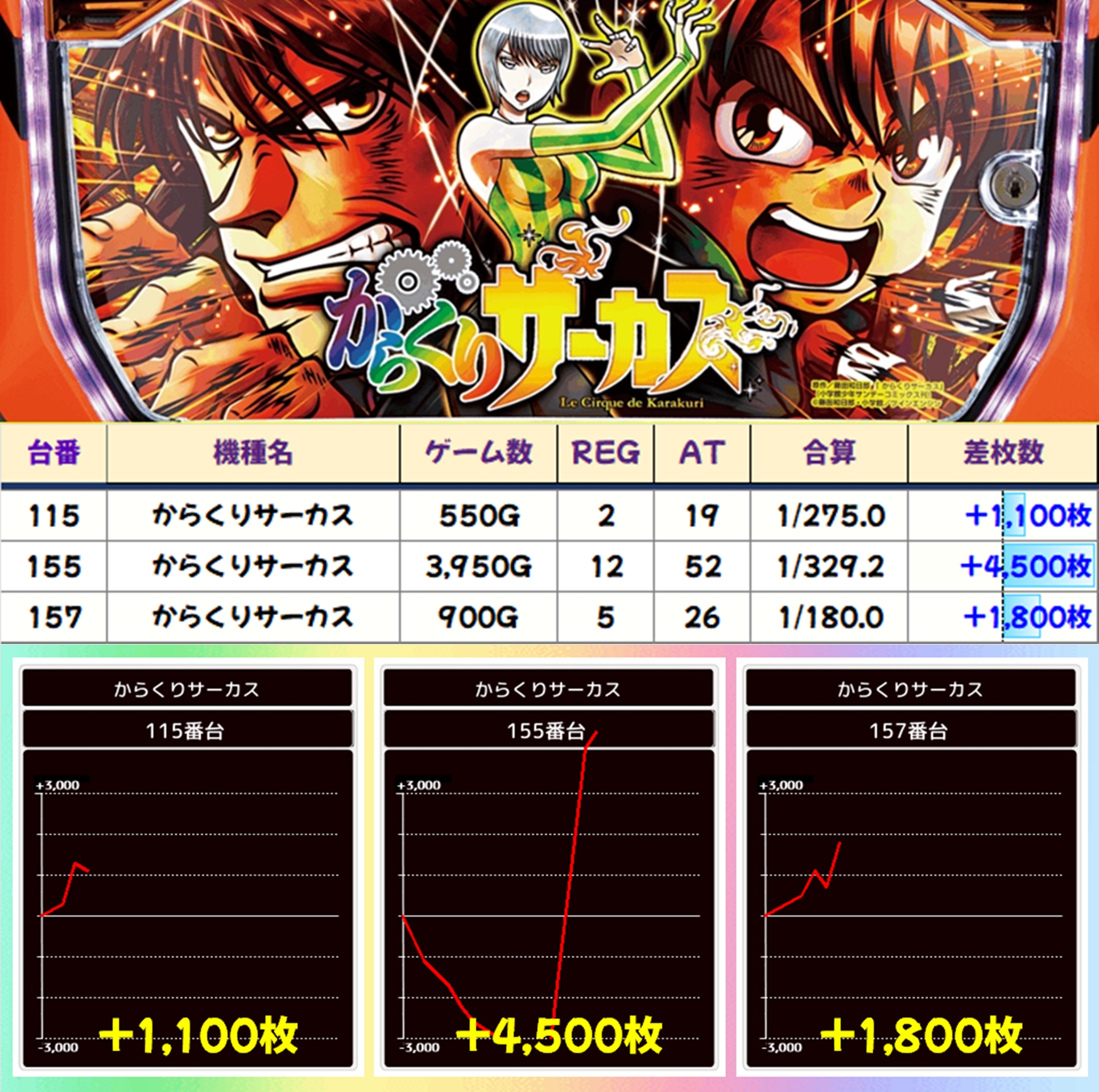 前日に爆裂していたからくりサーカスですが、この日は少々控えめな結果に…。それでも+4500枚の優秀な出玉が出現しておりました。