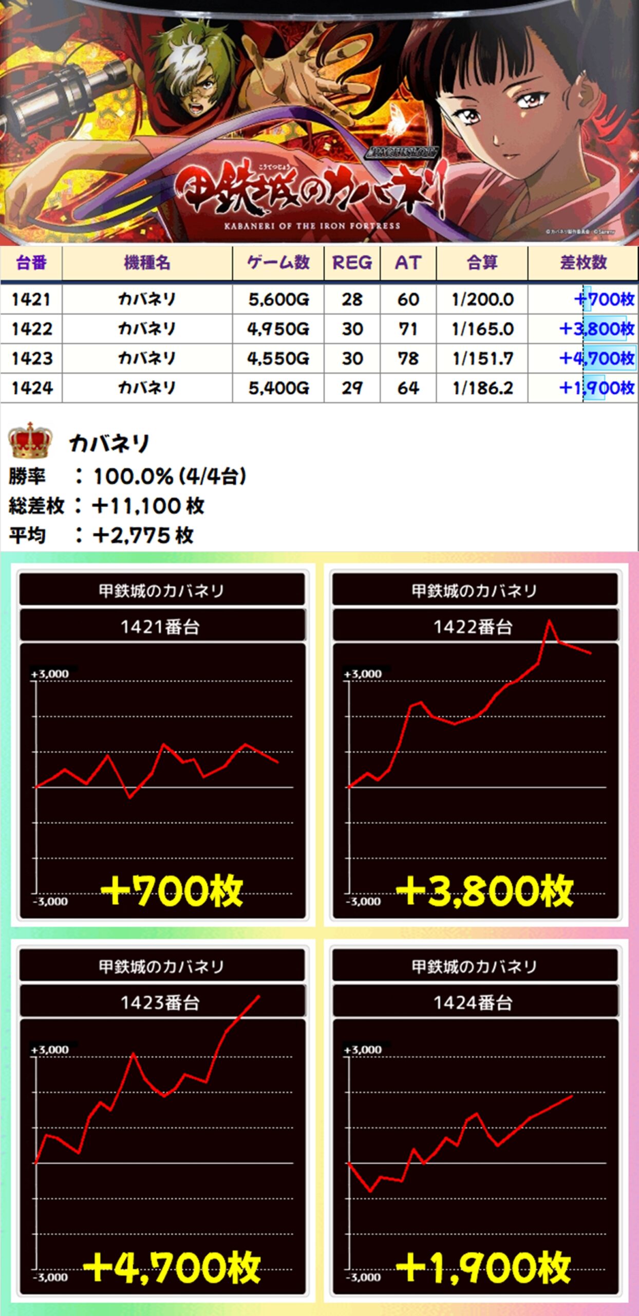 4台のカバネリもかぶぱポストにヒントがあり、全台系濃厚の結果に。+4700枚や+3800枚の大量出玉も確認できました!