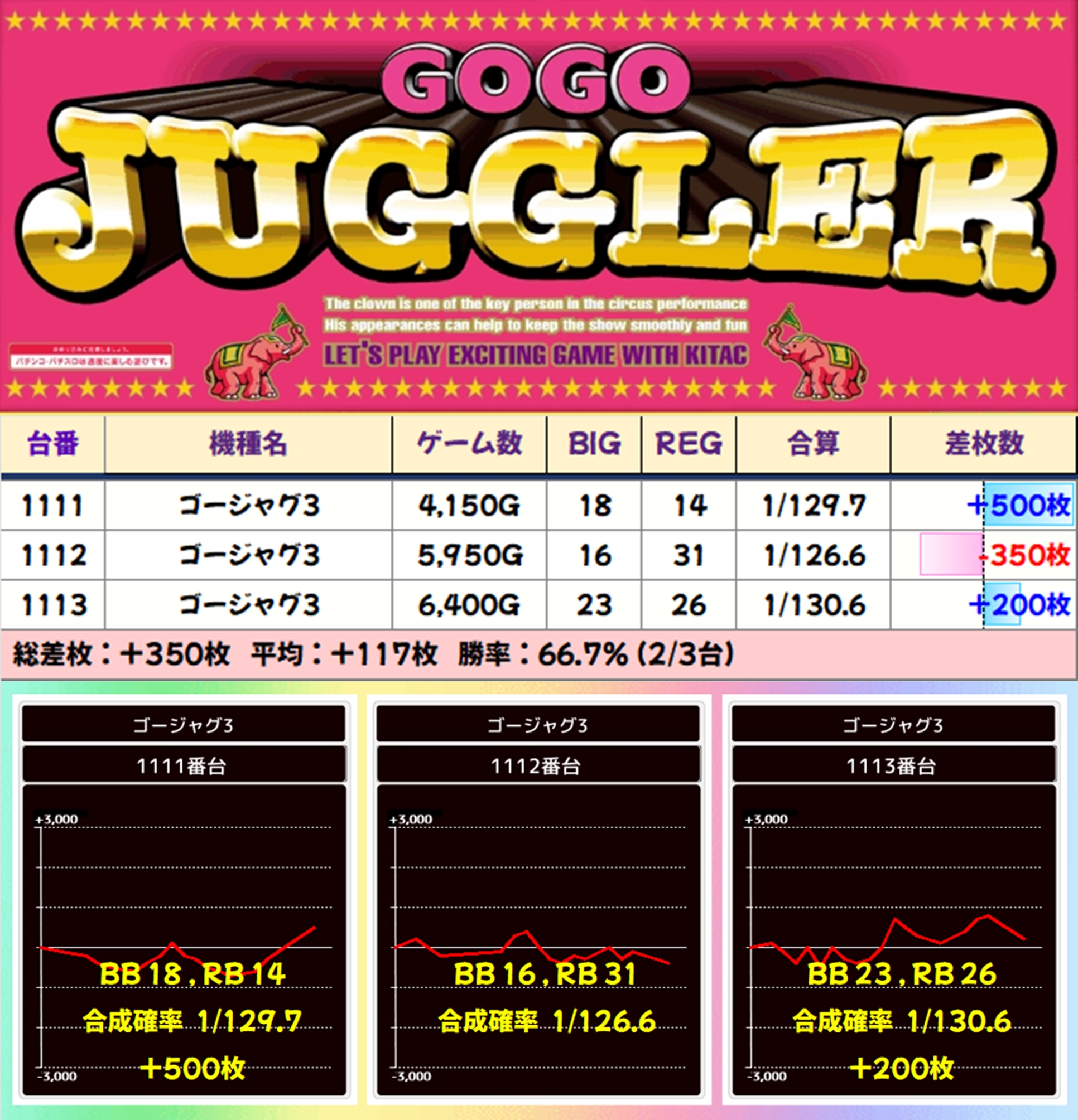 【3台並び】ゴージャグ3(1111-1113番台)→平均+117枚