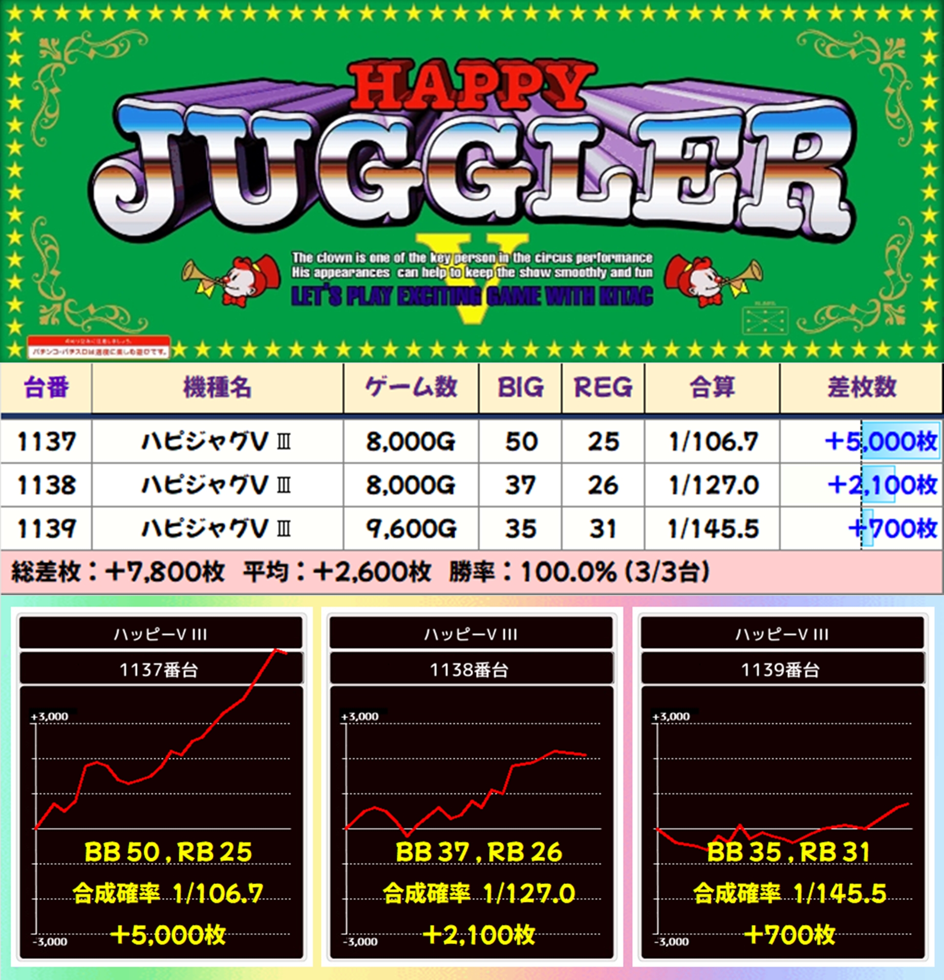 【3台並び】ハピジャグVⅢ(1137-1139番台)→平均+2,600枚