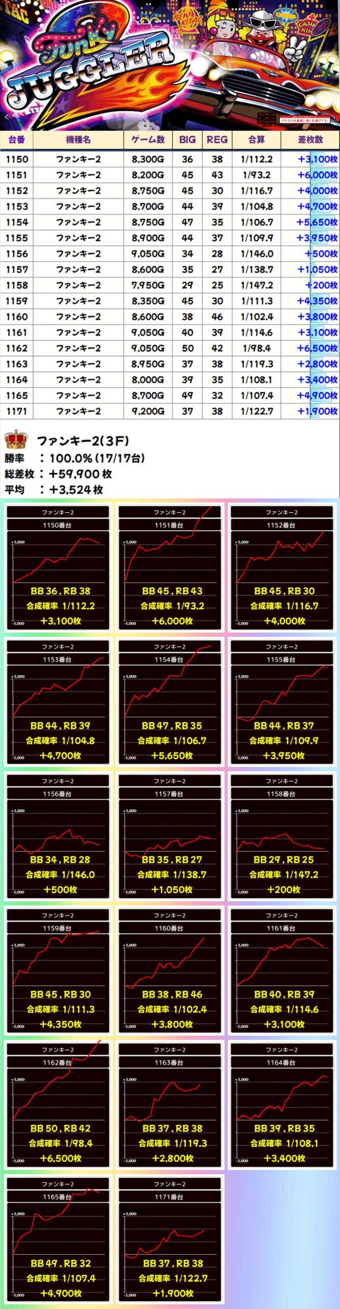 【全台系濃厚】ファンキー2(17/17台+)→平均+3,524枚