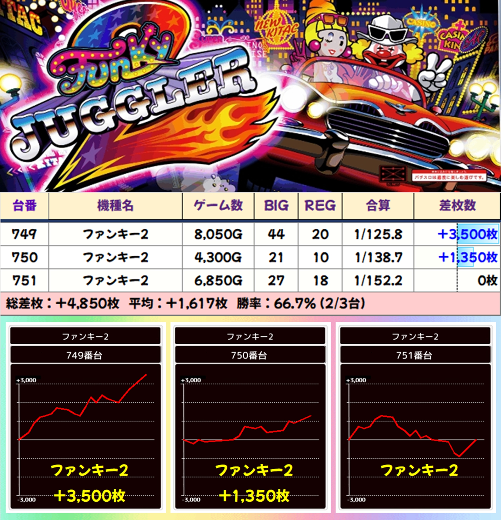【3台並び】ファンキー2(749-751番台)→平均+1,617枚