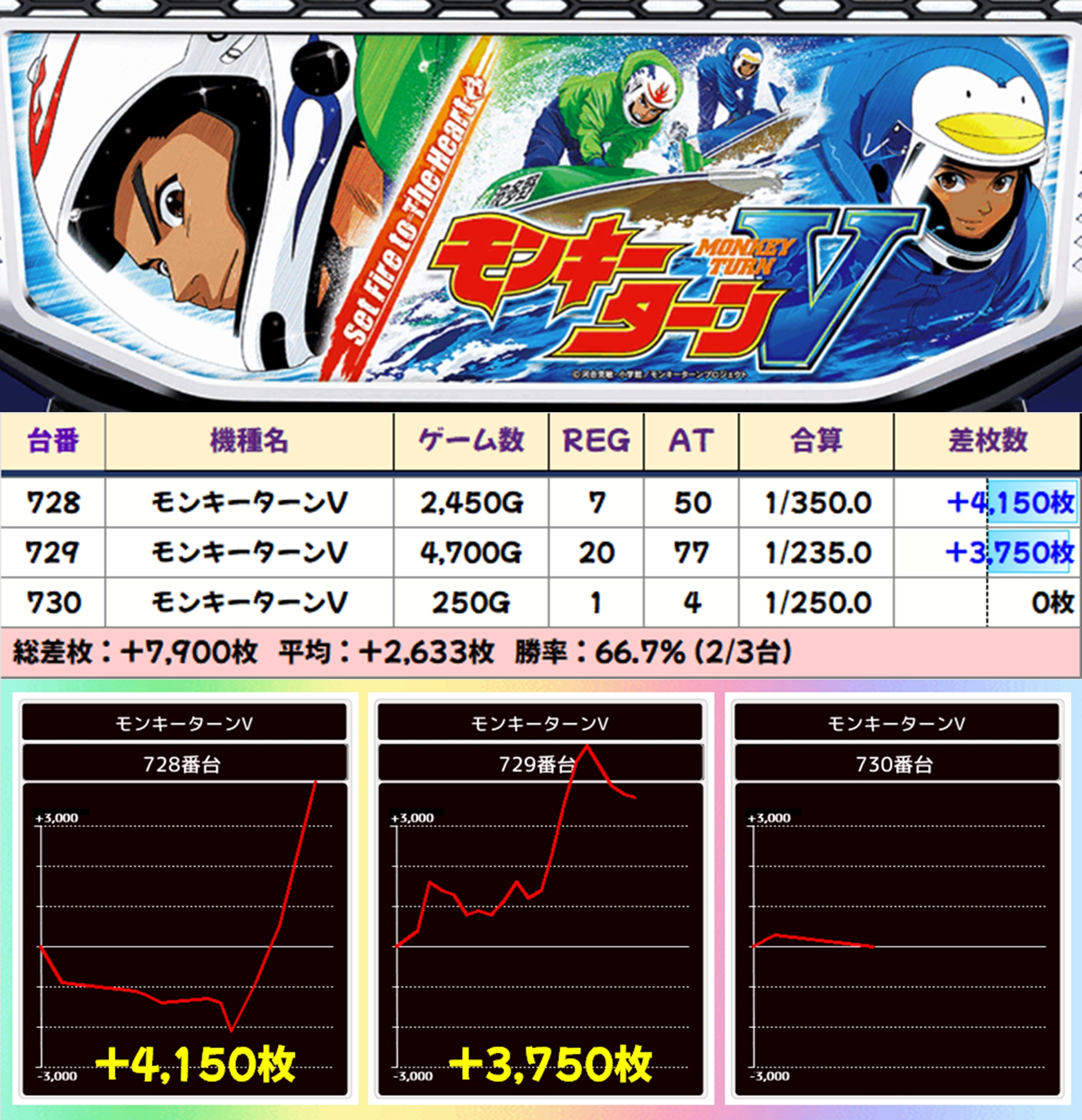 【3台並び】モンキーターンV(728-730番台)→平均+2,633枚