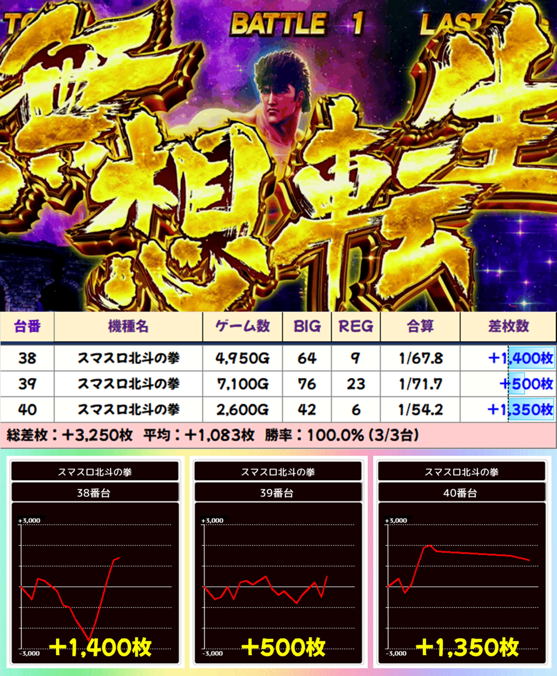 【3台並び】スマスロ北斗の拳(38-40番台)→平均+1,083枚