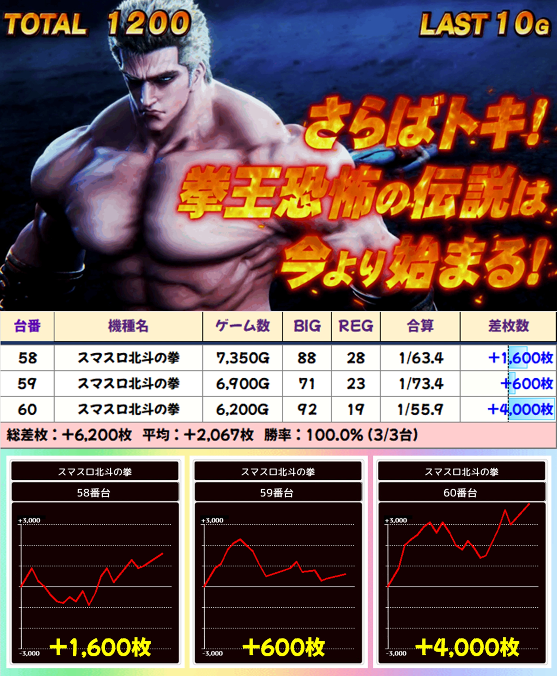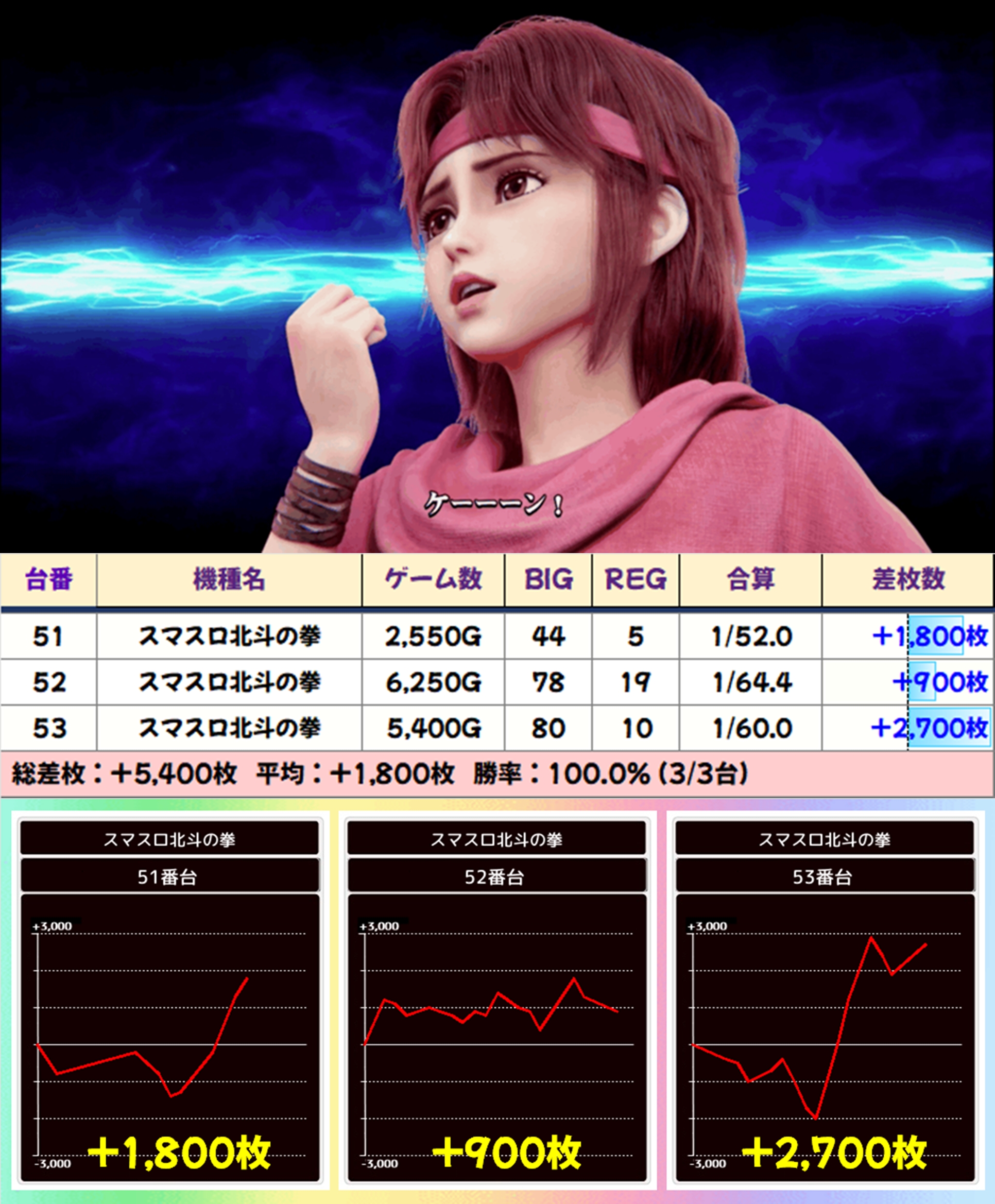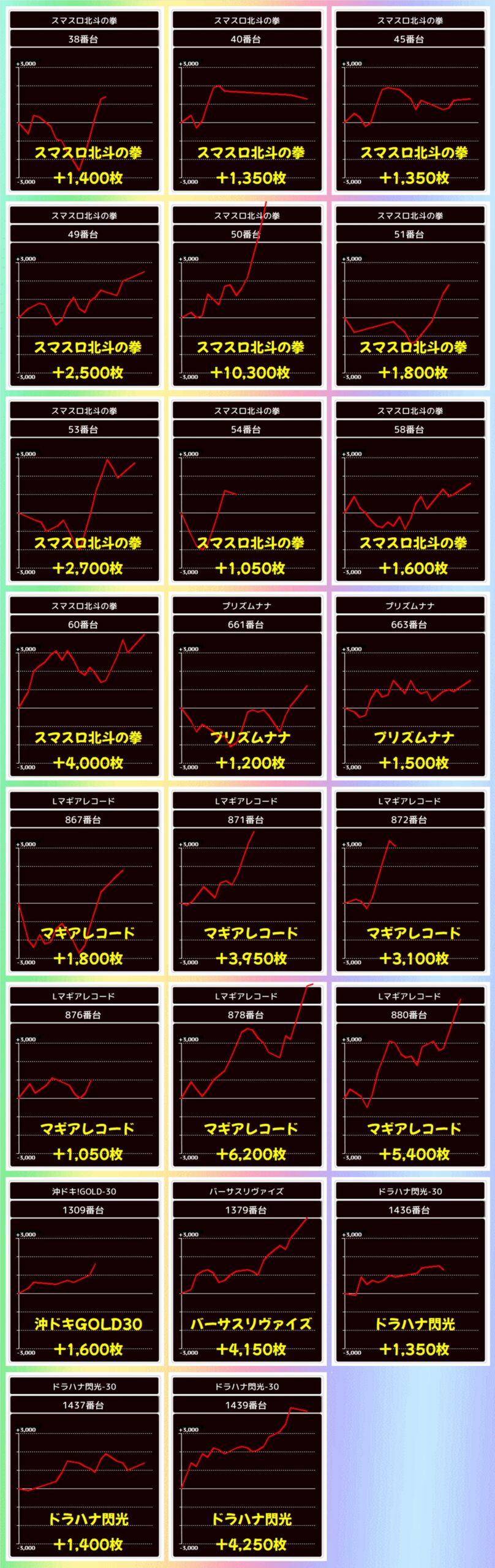 いずれの機種からも優秀な出玉を確認でき、スマスロ北斗の拳からは+10300枚の万枚オーバーも確認できました。