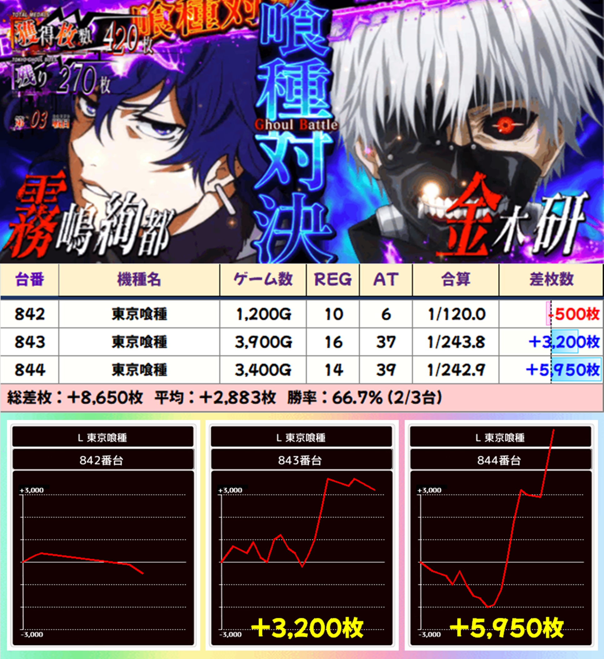 【3台並び】東京喰種(842-844番台)→平均+2,883枚