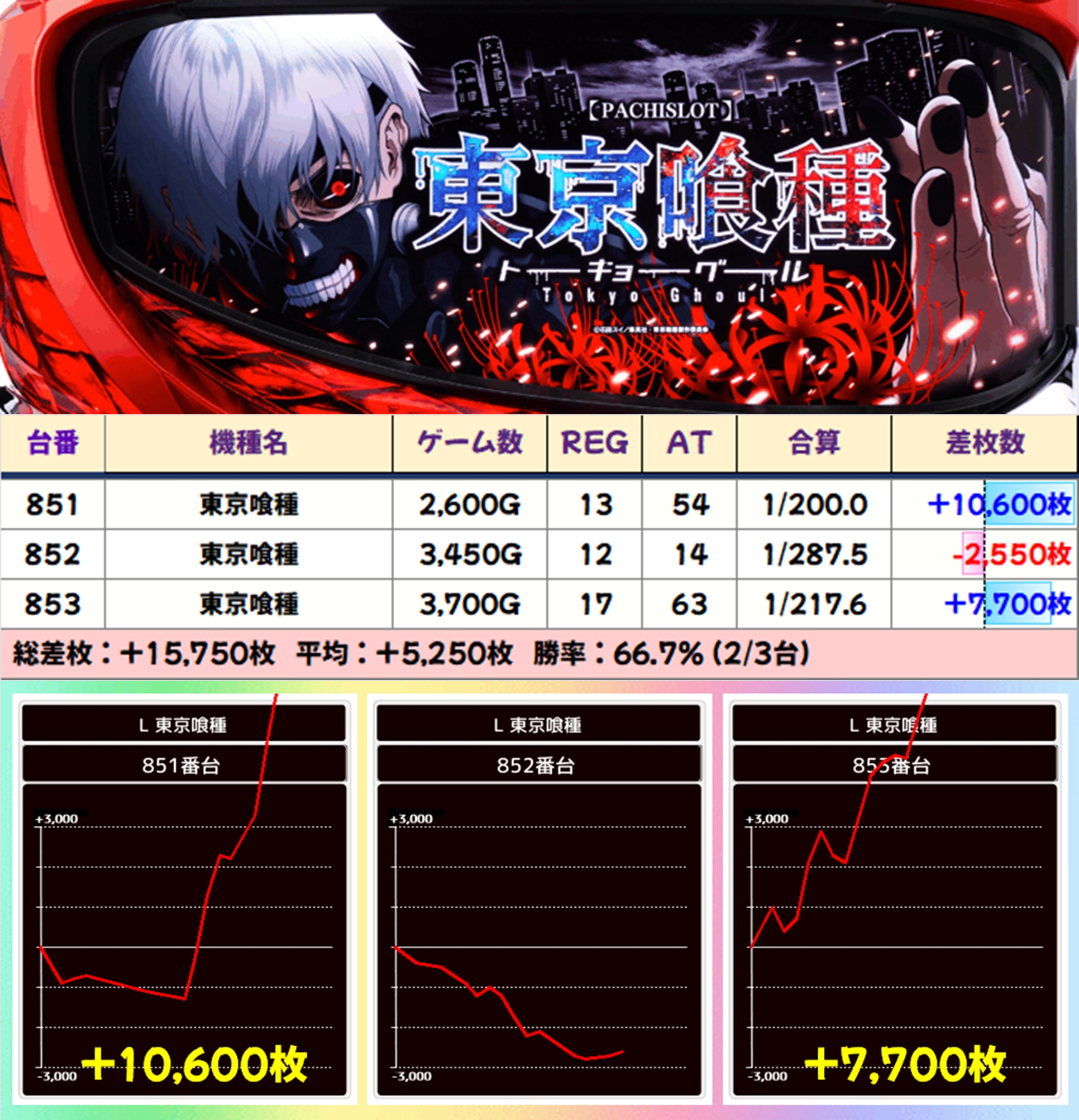 【3台並び】東京喰種(851-853番台)→平均+5,250枚