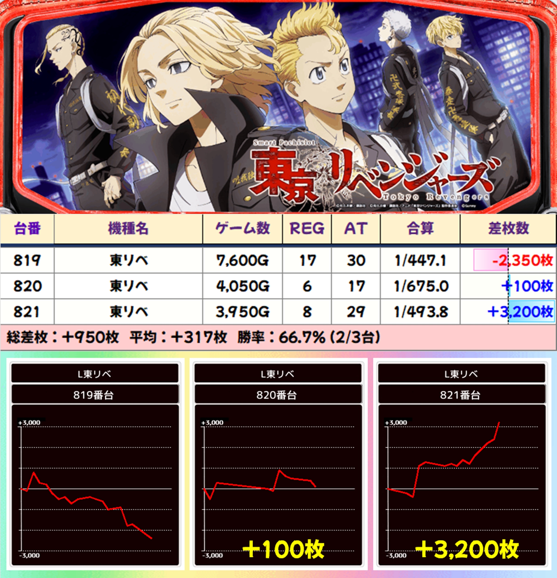 【3台並び】東リベ(819-821番台)→平均+317枚