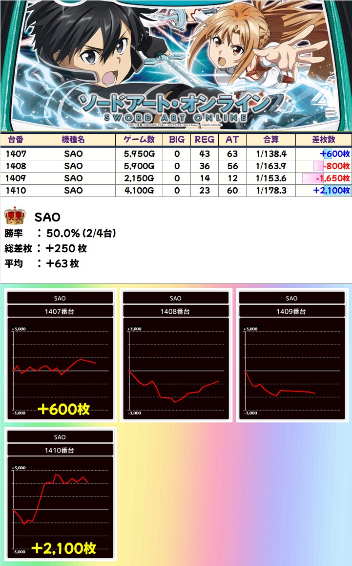 続いて紹介するのは「SAO」。+2100枚などの優秀台もあり半数の台がプラスに。『不発台も稼働している+⓪の日に期待できる大都機種』ということも考慮すると全台系濃厚だったかなと!