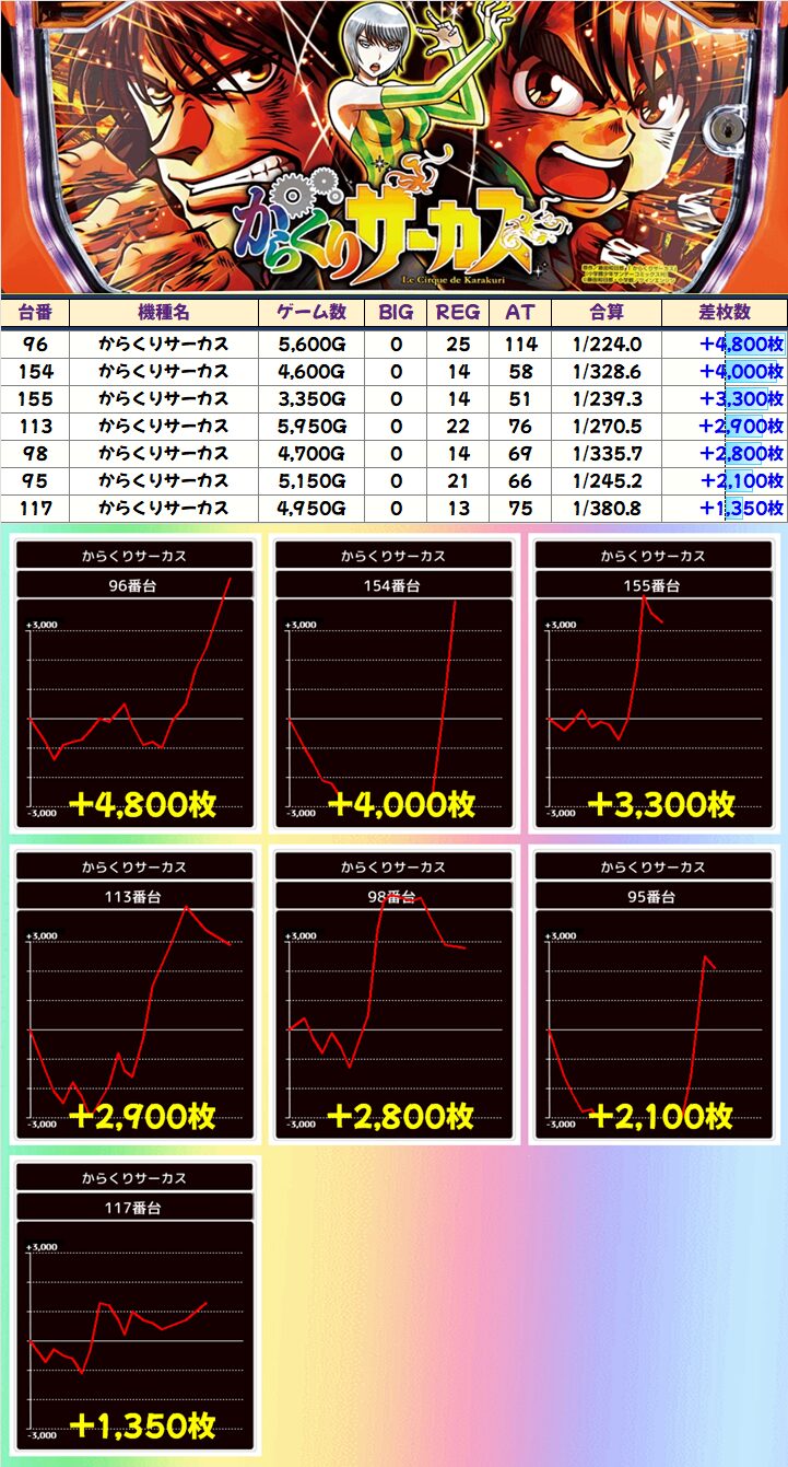 連日好調の「からくりサーカス」は、この日も複数の+4000枚以上など計6台が+2000枚を突破と躍動!