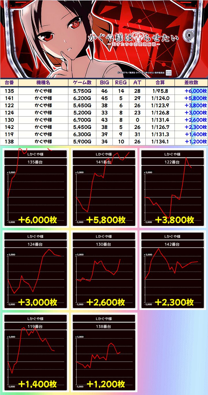 連日のように+5000枚オーバーの優秀台が複数出現している「かぐや様」から、この日も+6000枚クラスの爆裂台を複数確認!