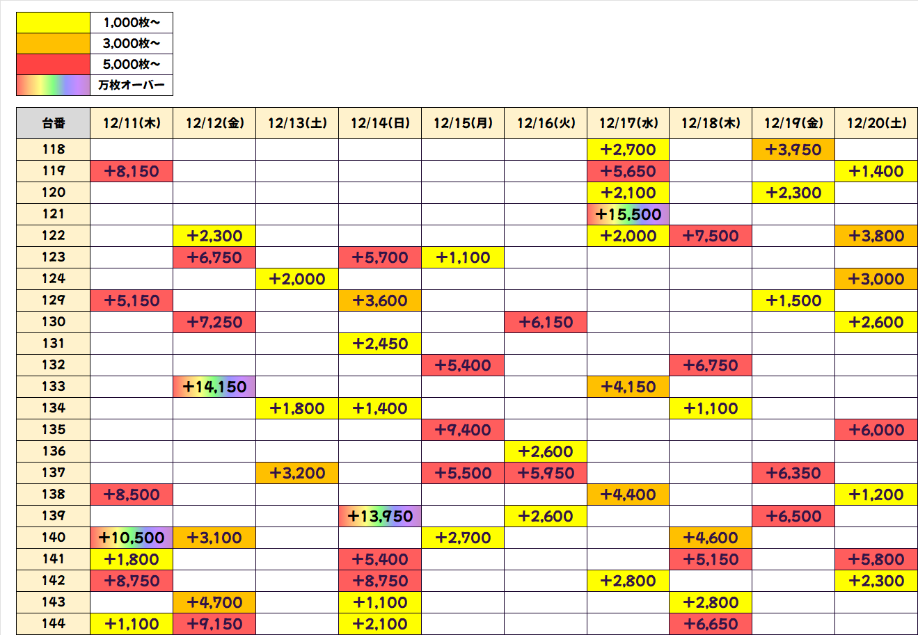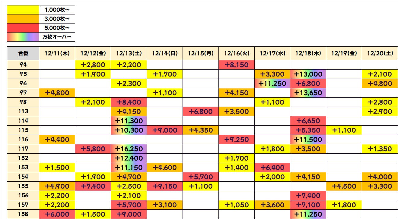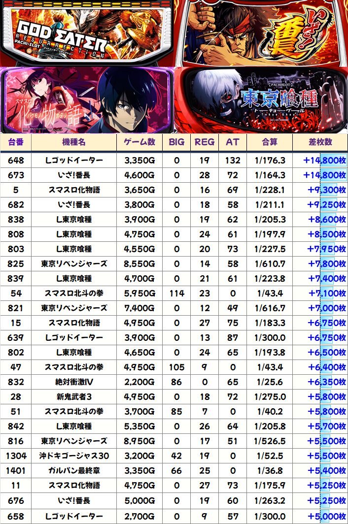 この日は多数の仕掛け以外からも優秀な出玉を確認!上記では+5000枚以上の優秀な単品をピックアップしましたが、「ゴッドイーター」「いざ!番長」の万枚オーバーなど30台に迫る台を確認!