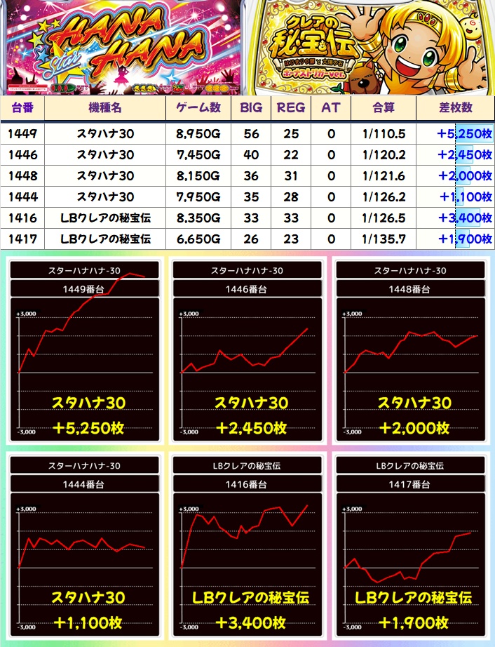 「スタハナ30」からは+5000枚以上、「クレアの秘宝伝」からも+3000枚以上など複数の優秀台を確認!