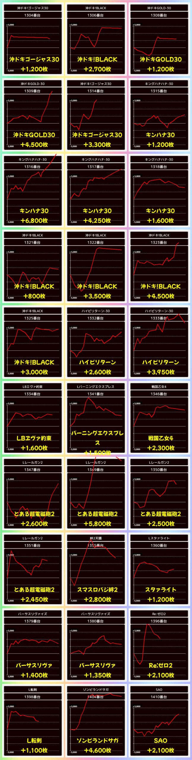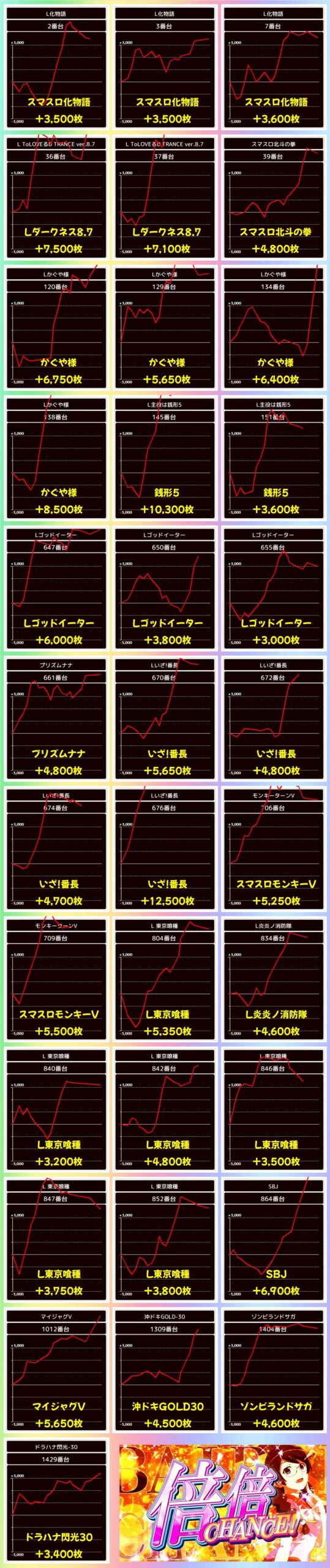 この日は多数の仕掛け以外からも優秀な出玉を確認!上記では+3000枚以上の優秀な単品をピックアップしました