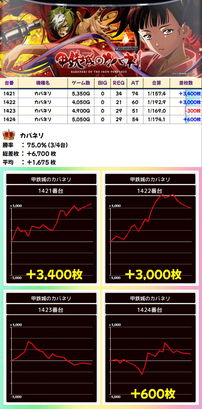 全系は特にキンハナが優秀で16台全台がプラス差枚!また、ジャグも複数シリーズが全系でこれらもぶん回されていました!また、4Fメダル機であるカバネリも優秀!