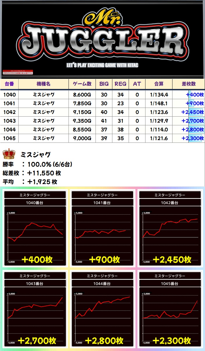 ミスジャグ(6/6台+)➡平均+1,925枚