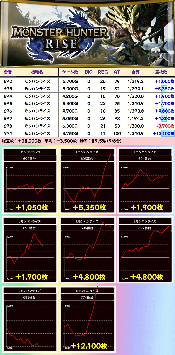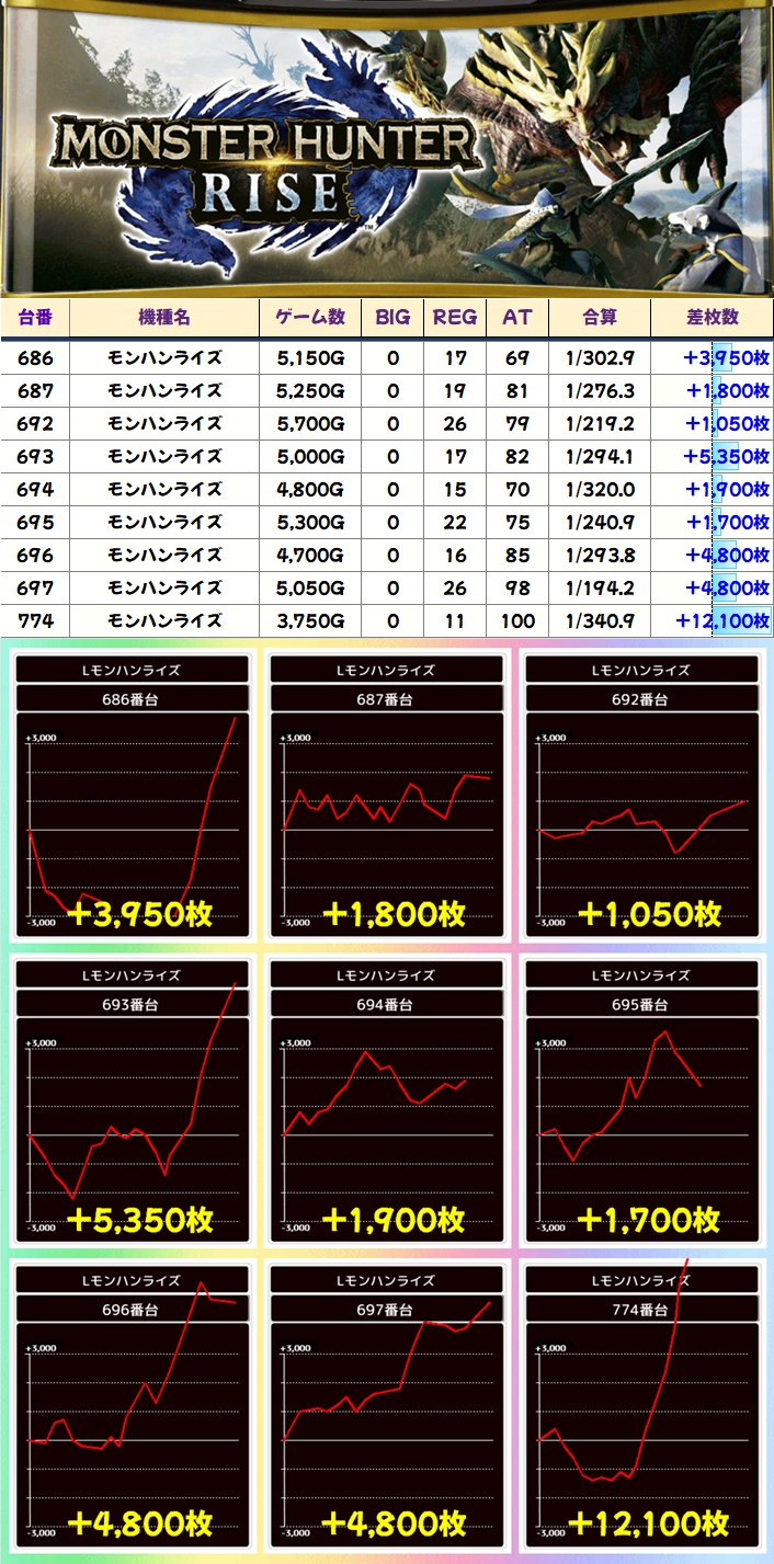 新たにポスター機種となったモンハンに列全仕掛け!万枚超や5000枚超も飛び出す優秀列でした!