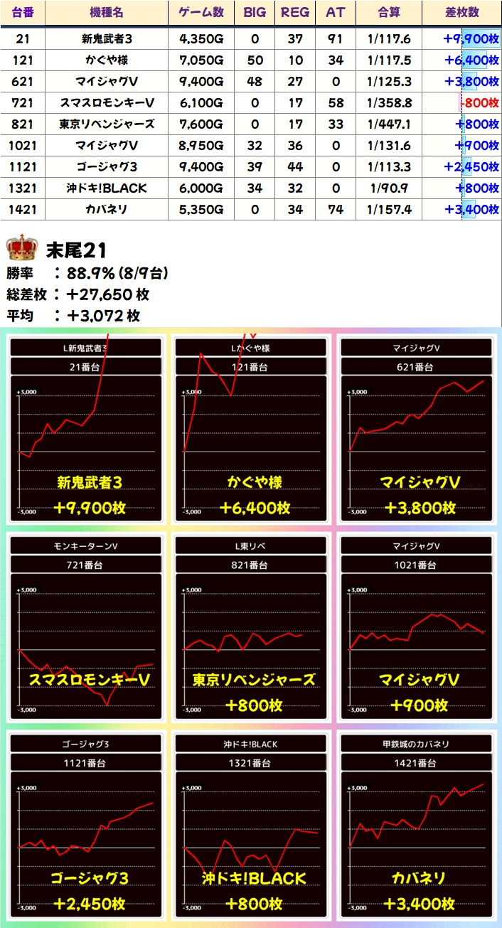 激熱7days期間中は毎日日付末尾が優秀になりがちで、今回も1台以外は全台プラス!良番であれば日付末尾から狙いたい期間ですよ