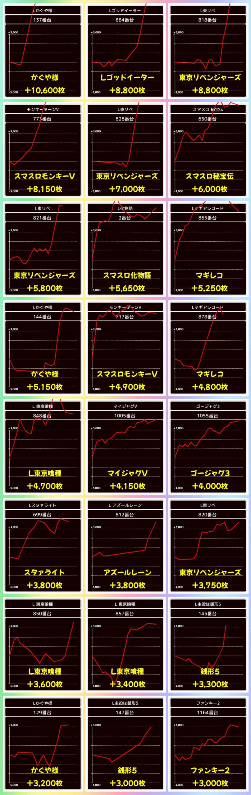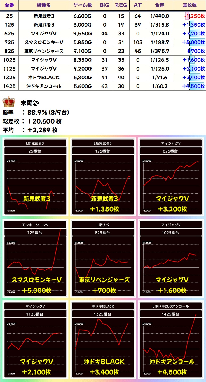 末尾㉕番台は、5の日機種「モンキーV」の+5000枚以上を筆頭に9台中8台がプラスと抜群の勝率で、平均+2200枚超と圧巻!全台系濃厚だった可能性も十分あったかなと!