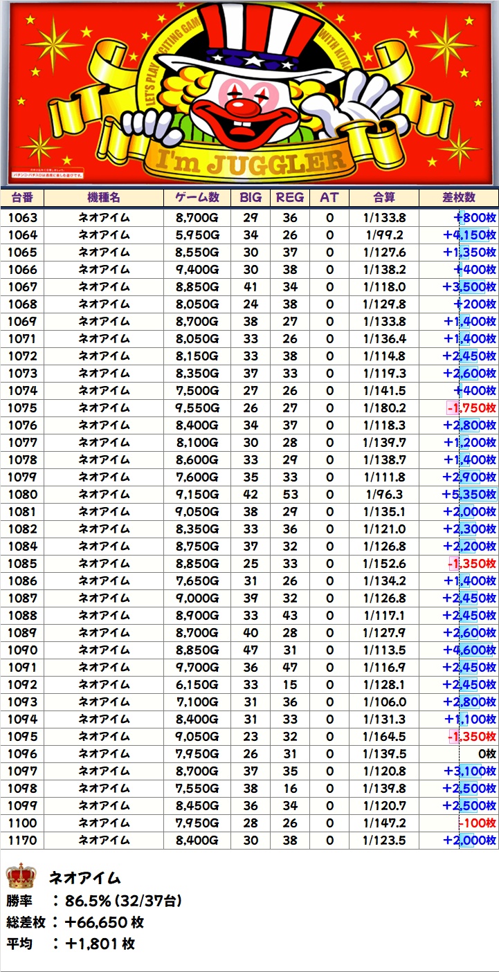 5の日機種でポストにもヒントがあった「ネオアイム」が37台中32台がプラスと文句ナシの好結果で全台系濃厚に!