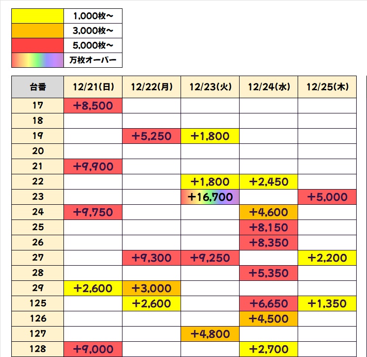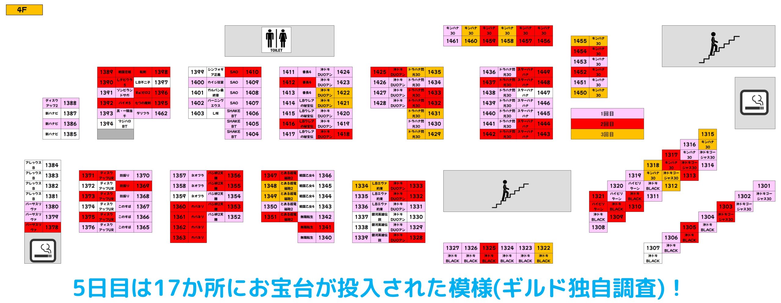 過去の傾向的に、27日までは対象フロアにお宝台が大量投入されますので、明日以降も積極的に4Fフロアを狙っていきたいですね。