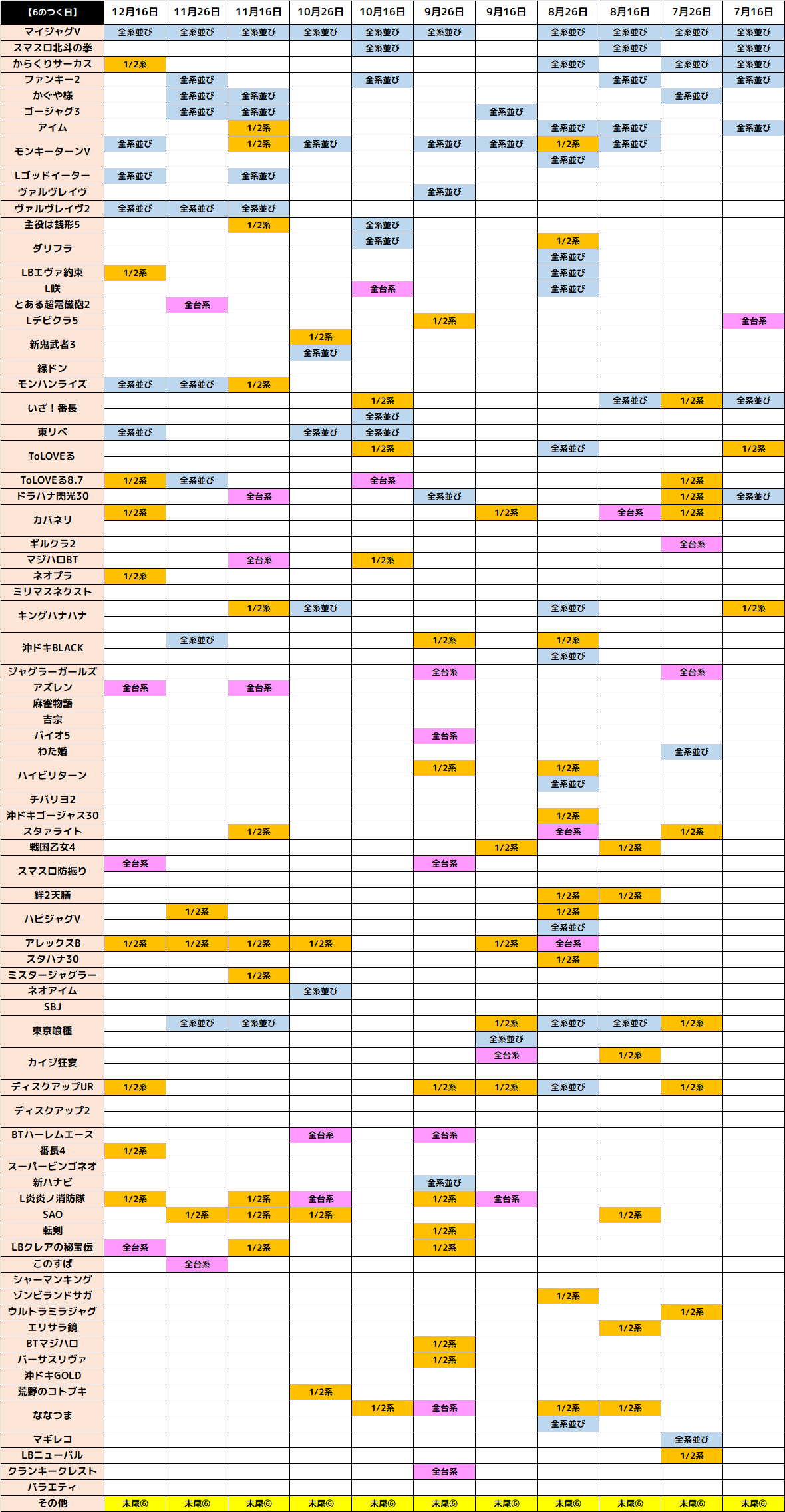 下記の過去の仕掛けでは、全台系・1/2系・並びの仕掛けが多数出現!今回も同レベルの仕掛けが出現するのは間違いないでしょう!