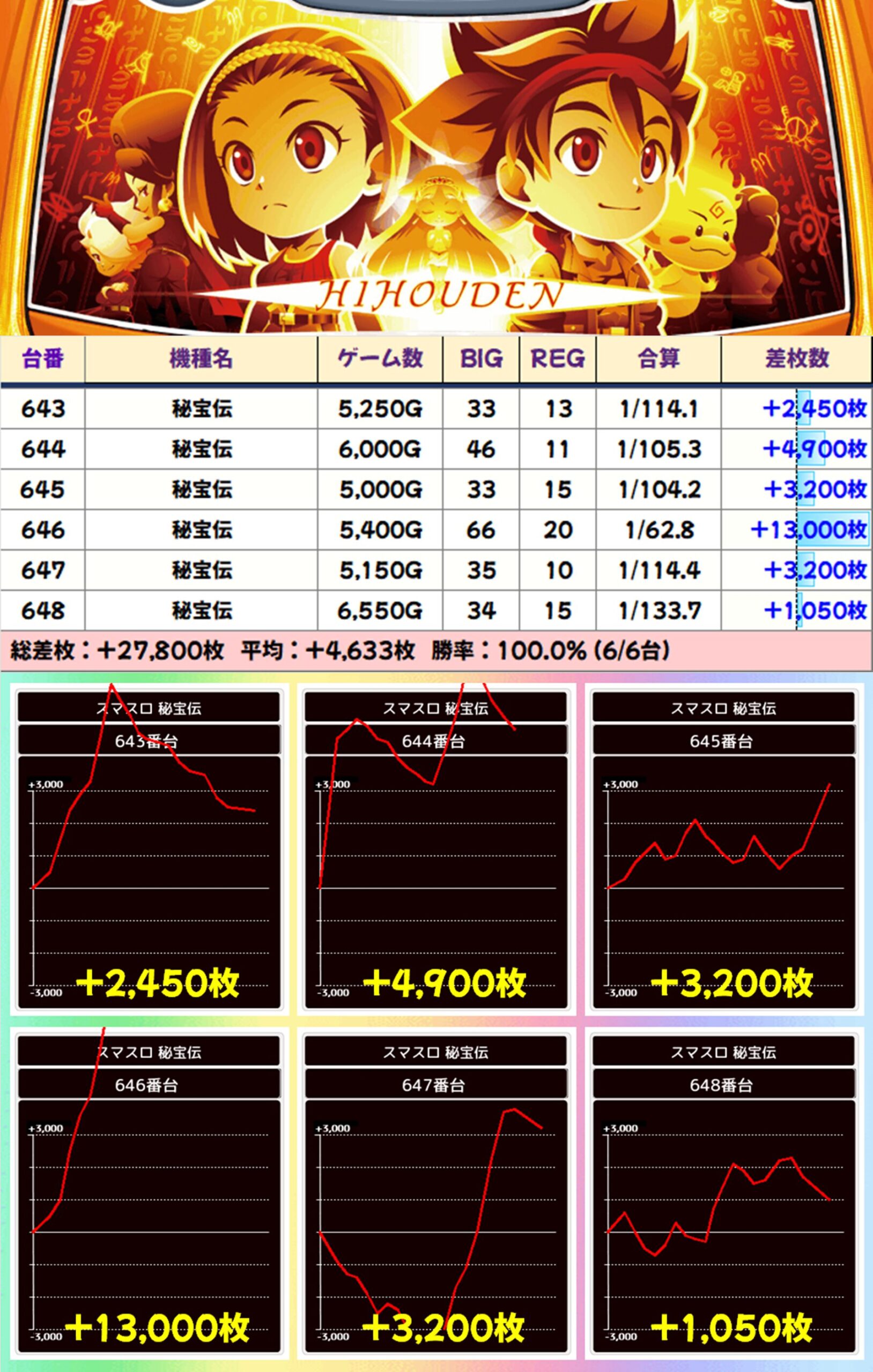 【6台並び】秘宝伝(643-648番台)→平均+4,633枚