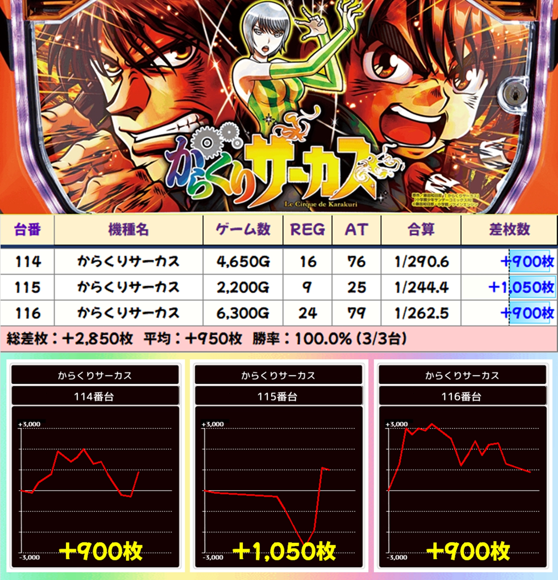 【3台並び】からくりサーカス(114-116番台)→平均+950枚