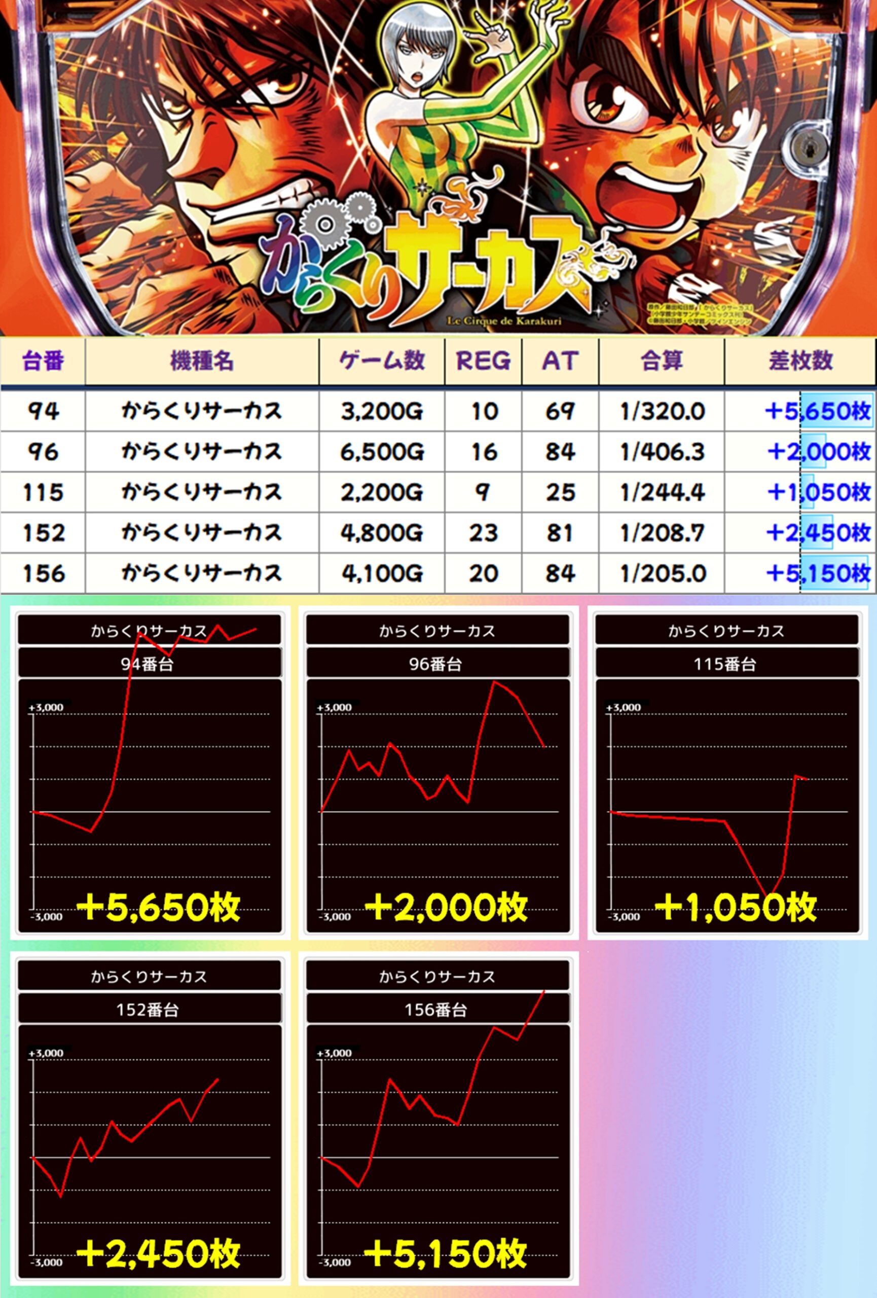 からくりサーカスにも並びの仕掛けがありましたが、こちらの並び以外から優秀台を確認。+5000枚オーバーが2台出現しました!