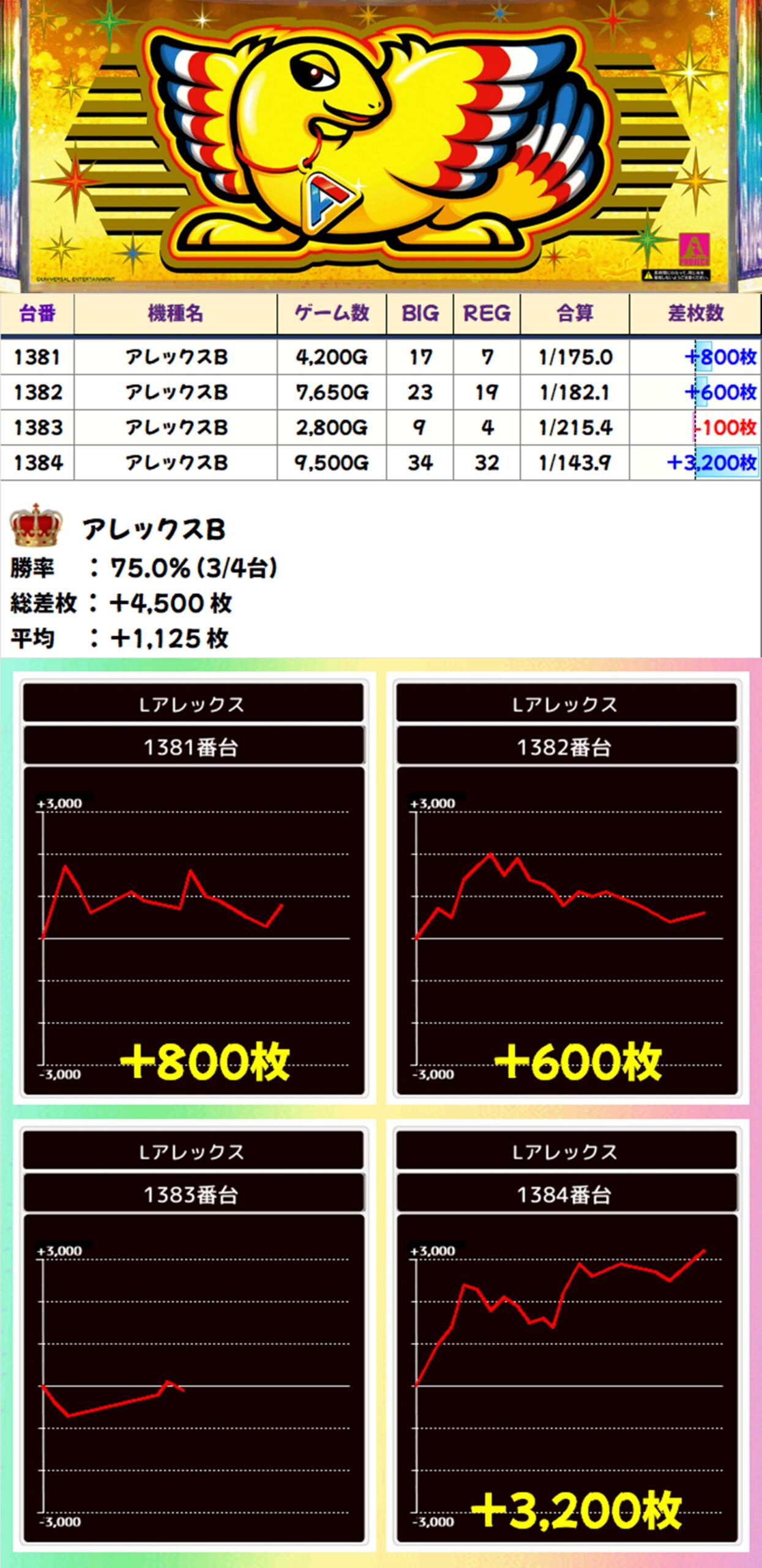 アレックスは出玉が伸び悩んだ台があったものの、+3200枚の出玉も出現。マイナスの台はちょっと打ち込みが弱かったことが残念でしたね…。
