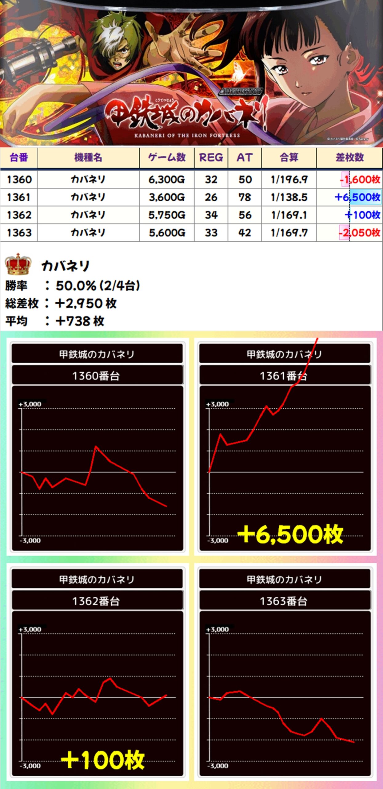 全台系濃厚の仕掛けや1/2系濃厚の仕掛けがあった機種も含まれますが、4Fからは多数のお宝台が出現し、平均で+2738枚という見事な結果となりました!