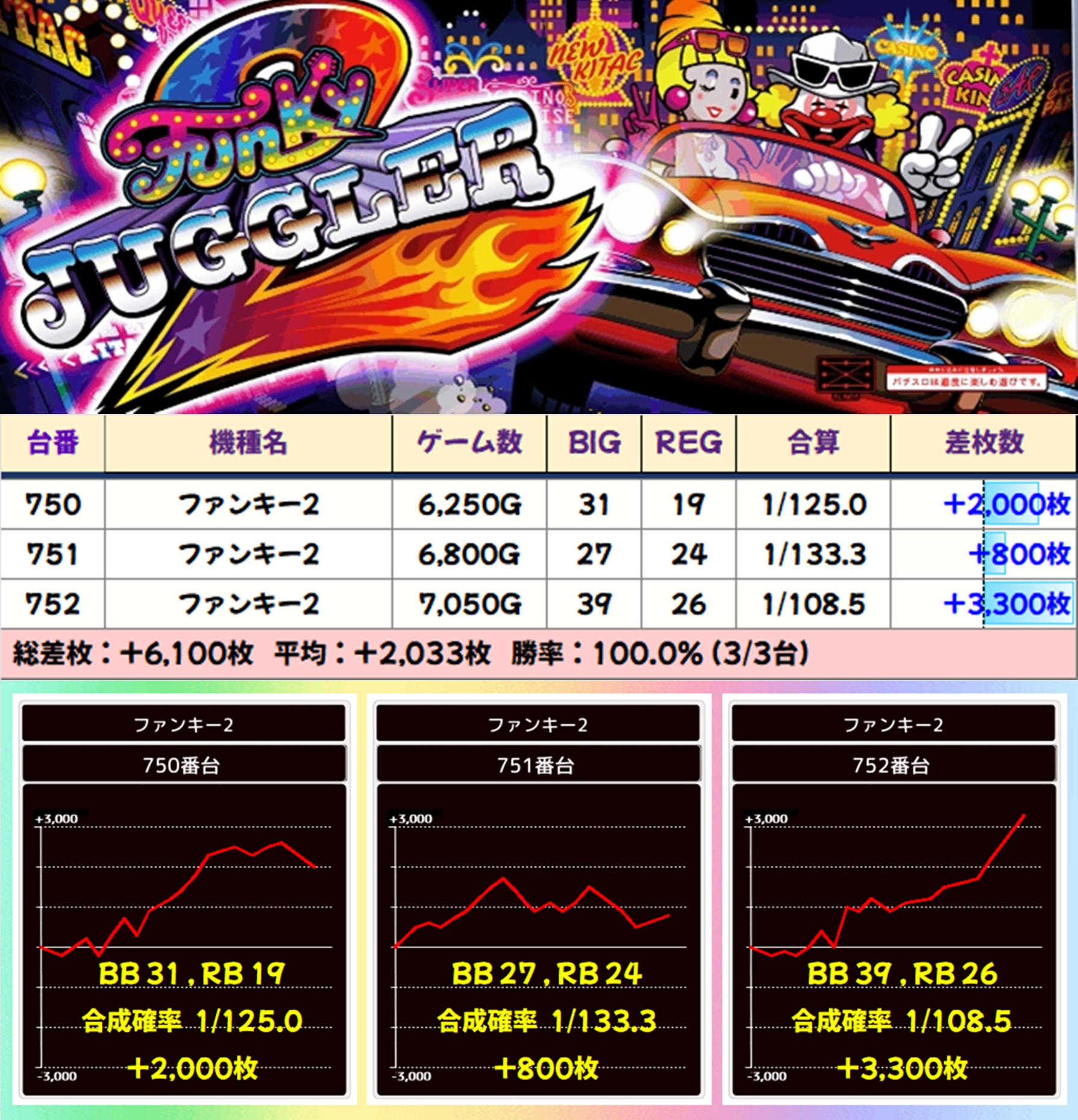 【3台並び】ファンキー2(750-752番台)→平均+2,033枚