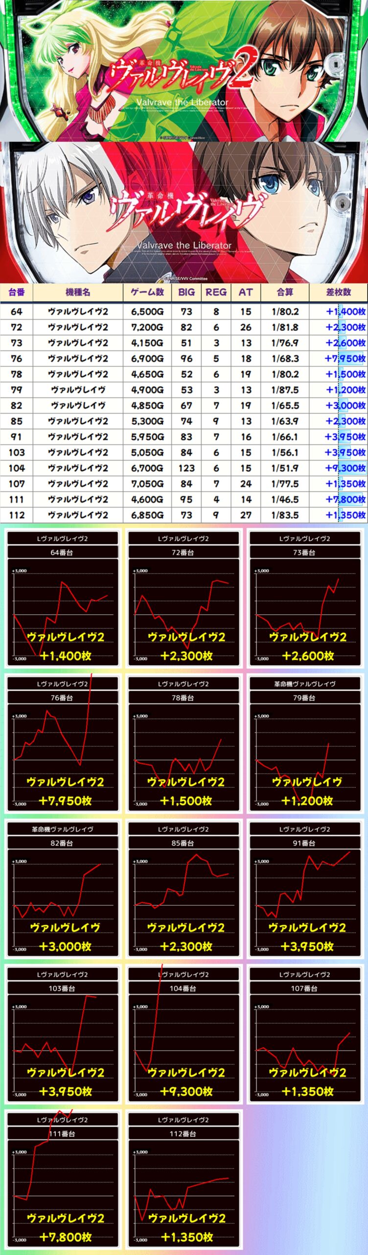 ヴァルヴレイヴ2には並びの仕掛けがありましたが、並び以外から+9300枚や+7800枚、+7950枚などの爆発台が多数出現!初代からは+3000枚の出玉を確認できました。